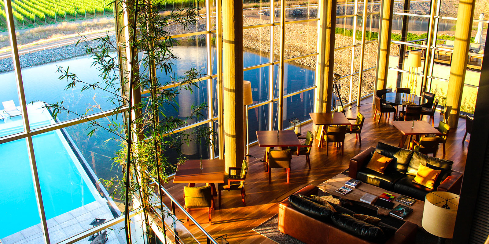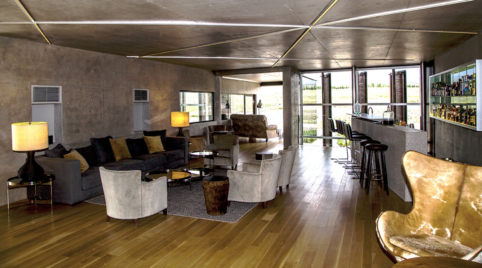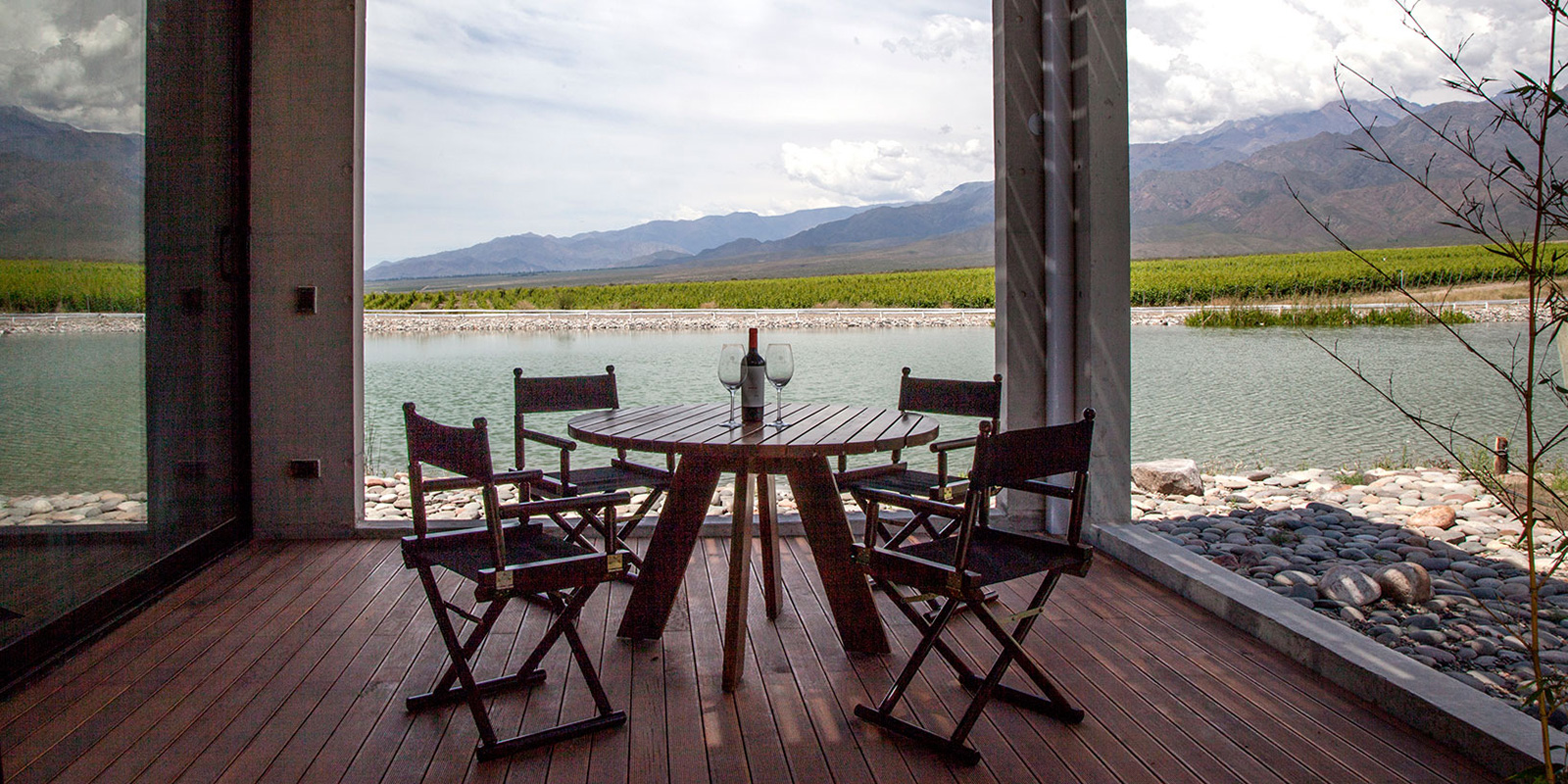 Set on a 790-acre estate in the foothills of the Andes Mountains, Casa de Uco has a sleek, minimalistic style designed to harmonize with the surrounding landscape. Common areas include an award-winning restaurant, wine bar and lounge, outdoor pool, game room, and a living room with fireplace. Terraces overlook the private vineyards, where guests can dine among the vines or participate in excursions like wine tasting, horseback riding, and carriage rides.