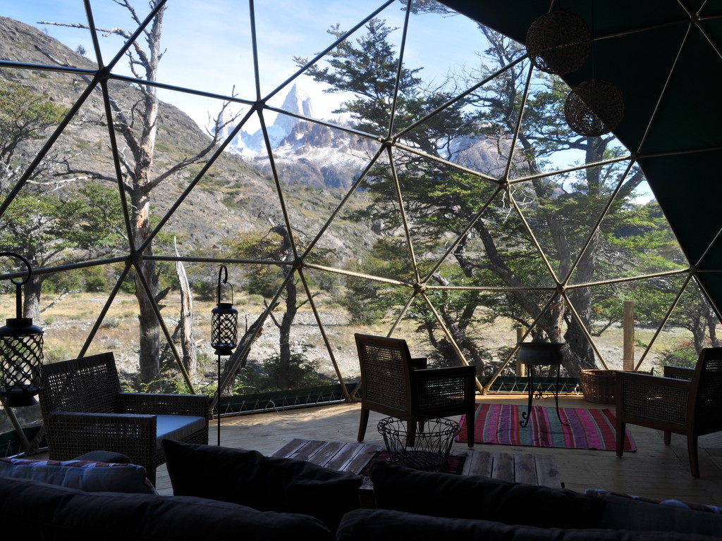 Patagonia Eco Domes offers upscale camping in first class geodesic domes. With their location near Los Glaciares National Park, small footprint, and tasteful construction, these private domes are a unique and comfortable lodging option. The site offers a great view of Mount Fitz Roy and private access to the Laguna de los Tres trail. Each of the seven domes has a private bathroom and woodstove and is powered by solar panels. The community dome has a restaurant and lounge area. Accommodations are rustic (the site is isolated and there is no internet or cellular service) but very well located and an excellent option for travelers who want to disconnect and enjoy nature.