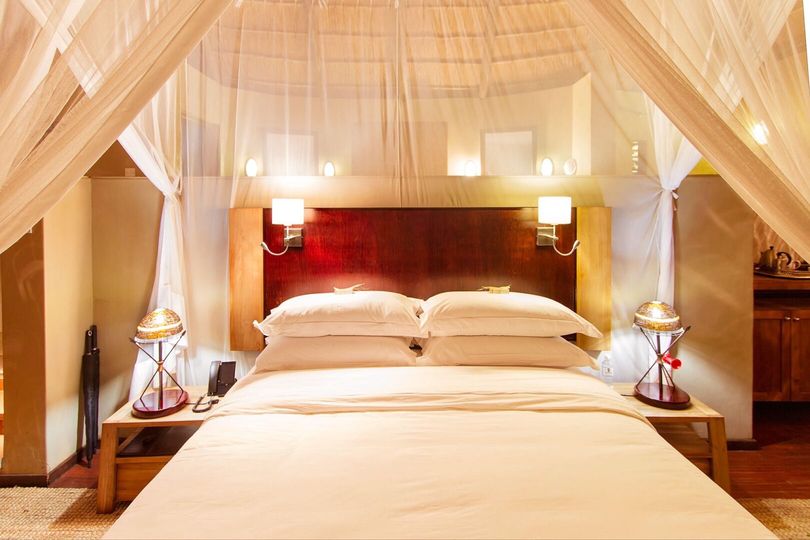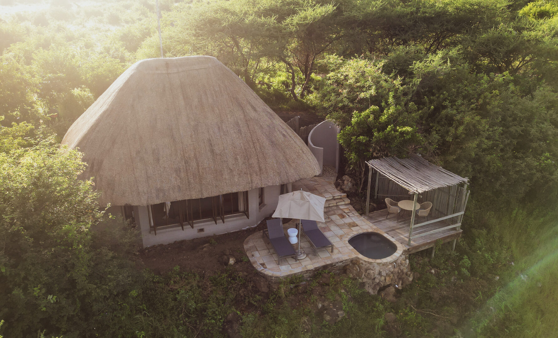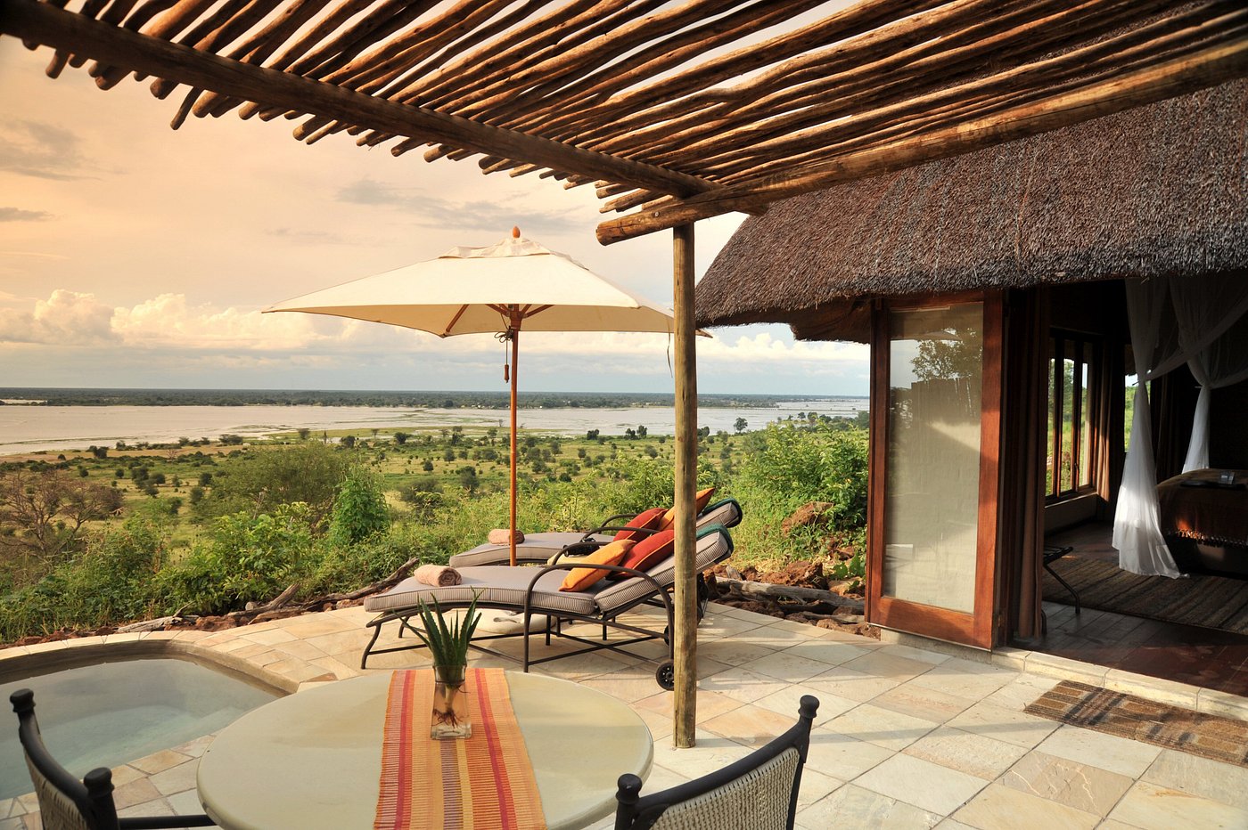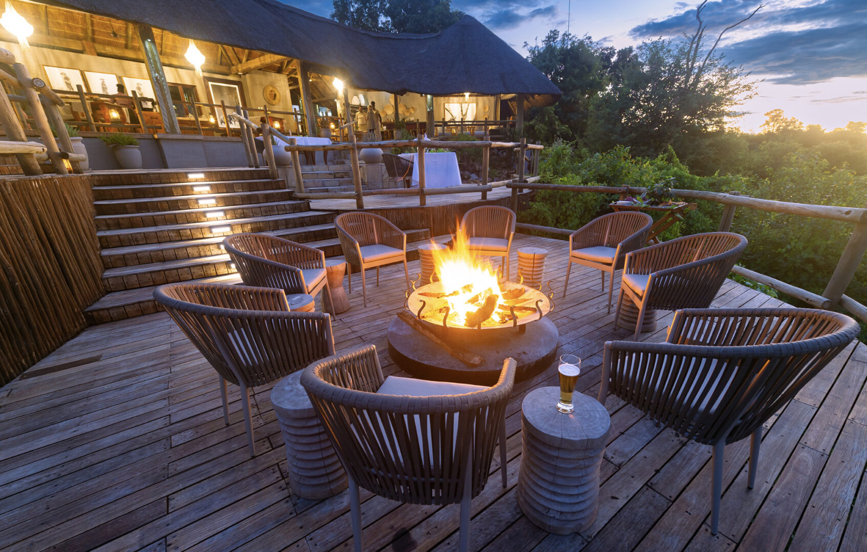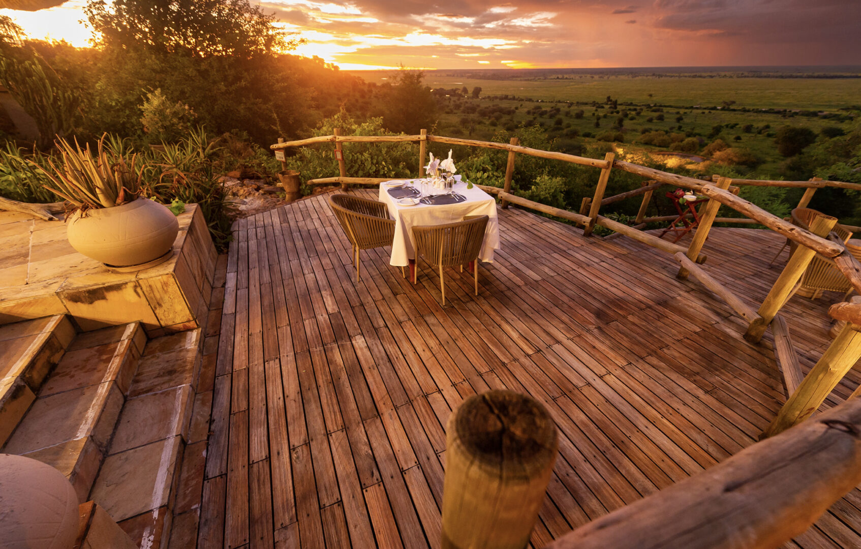 Located in the Chobe Forest Reserve in Western Botswana, the private Ngoma Safari Lodge is located on the edge of a plateau, offering endless views over the seasonal Chobe flood plain. There are six Double Luxury Suites and two Triple Luxury Suites, each a perfect combination of natural splendor and comfort, and all eight suites offer breathtaking views over the Chobe flood plain. Each suite has a private deck with an outdoor shower and a plunge pool. The main lodge area has a restaurant, bar, lounge, sundeck, and a large volcanic rock-finished swimming pool.