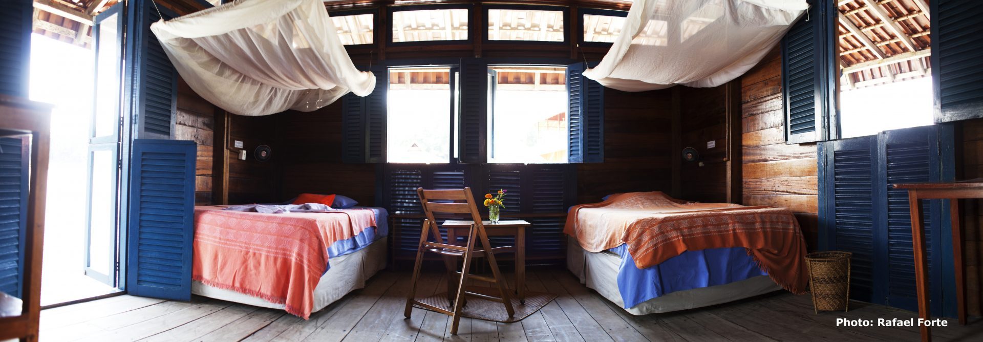 Uakari Floating Lodge sits within the Mamirauá Sustainable Development Reserve, a site recognized by UNESCO as part of the Natural Heritage of Humanity. Mamirauá Institute and the communities from Mamirauá Reserve share in the management of the lodge. Guests stay in thatched-roof floating huts, each with its own terrace, bathroom with hot water shower, two large single beds, and a terrace with a hammock. This is a real ecotourism lodge: accommodations are comfortable, but basic. Rooms have solar powered lights and showers with solar heated water. Meals are plentiful and very well prepared.