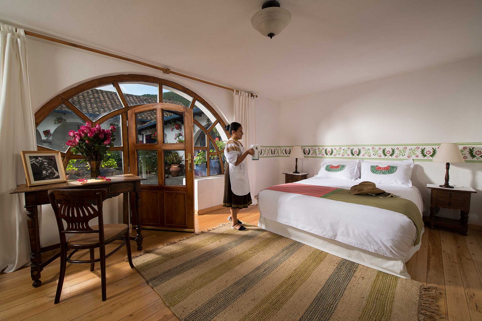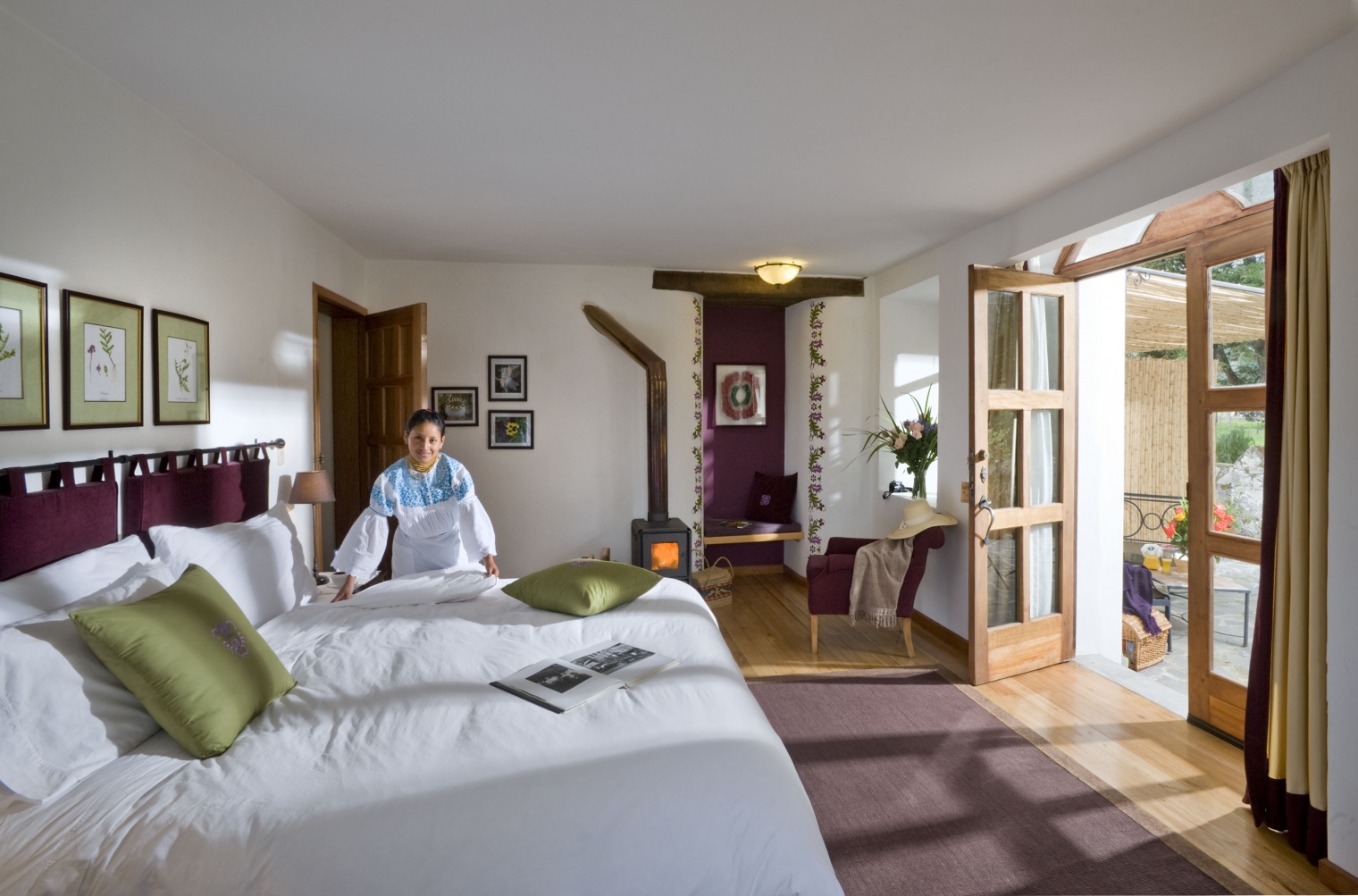 Situated on 4,000 acres in an Andean valley and owned by the family of two former Ecuadorian presidents, Hacienda Zuleta invites guests to experience life in a restored 17th-century country estate. This working hacienda features a dairy and trout farm, a flock of sheep, a cheese factory, an embroidery shop creating exceptionally high quality textiles, and a stable of beautiful horses that you can take out around the property and into the mountains. Active in conservation and preservation, the hacienda has its own Andean condor rescue project as well as several pre-Colombian burial mounds often being worked on by visiting archeologists. Each of its nine guest rooms has a fireplace and its own unique personality. Meals feature organic vegetables, which are grown on the hacienda premises.