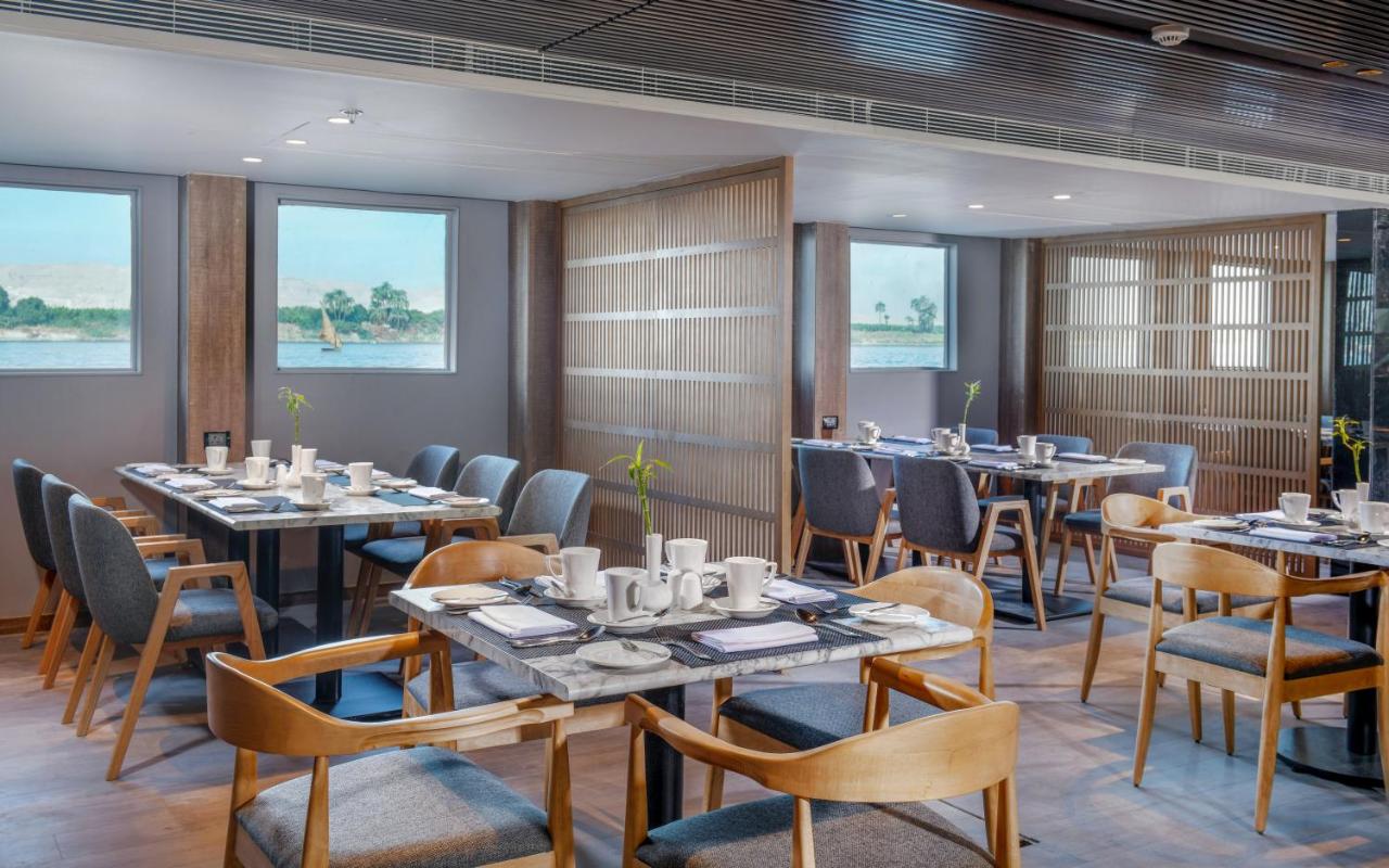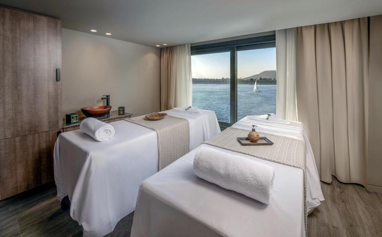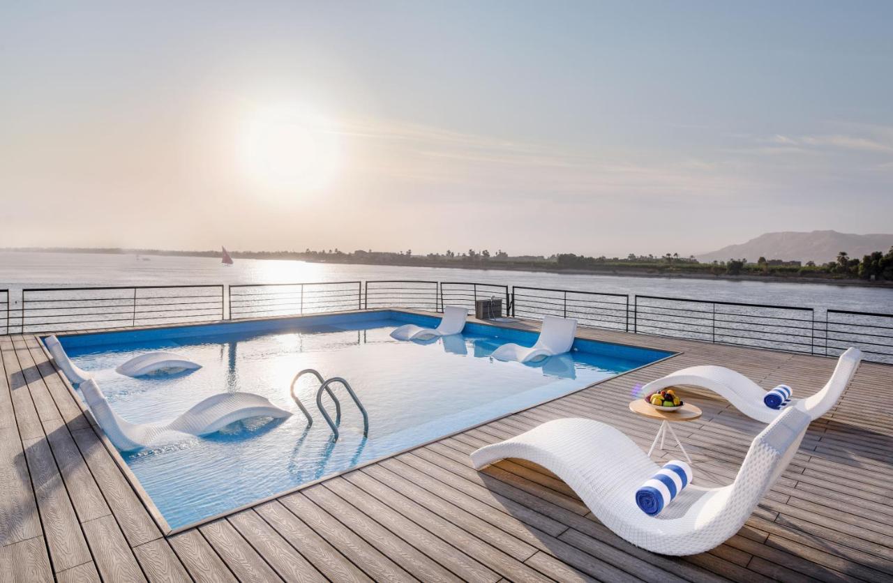 The Historia cruise embraces stylish comfort. With Egyptian-inspired furniture throughout, this 5-star cruise draws on the heritage of the land, with perforated rattan screens to allow an interplay of light and shadow and give a soft, diffuse glow to the luxurious surroundings. Take in the sights and sounds of life along the Nile and soak in the sun rays aboard the Historia’s solaria deck. Enjoying uninterrupted view from the luxury of the ship’s swimming pool is the perfect way to cool off after a day of exploring historical sites. A wide range of suites are available, each outfitted with luxe amenities to ensure a comfortable stay. Onboard there's a bar, lounge, and restaurant, as well as a gym and spa.