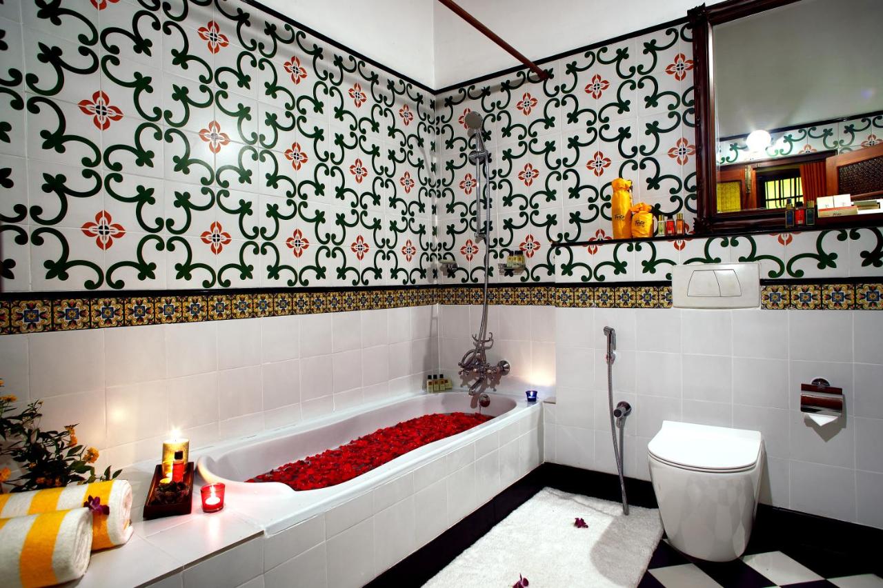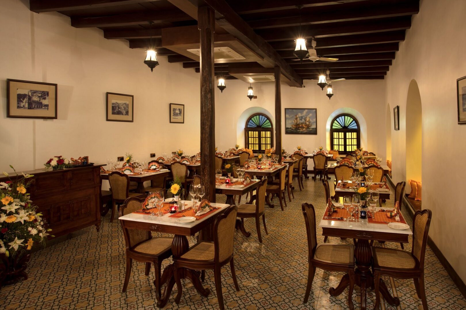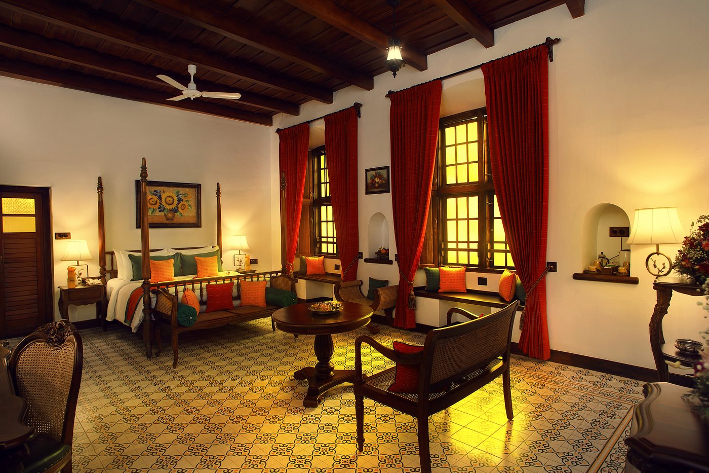Forte Kochi Hotel is a heritage hotel offering 5-star accommodation on Princess Street in Fort Kochi. 27 carefully crafted rooms are on offer, each a gorgeous mix of old world charm and modern luxury amenities. Colorfully tinted windows, antique wooden furniture, and large, inviting four poster beds, and fully-stocked minibars adorn each room. Guests can enjoy reading in the library, dining in the central courtyard, swimming in the pool, having an afternoon espresso in the coffee lounge, and more.