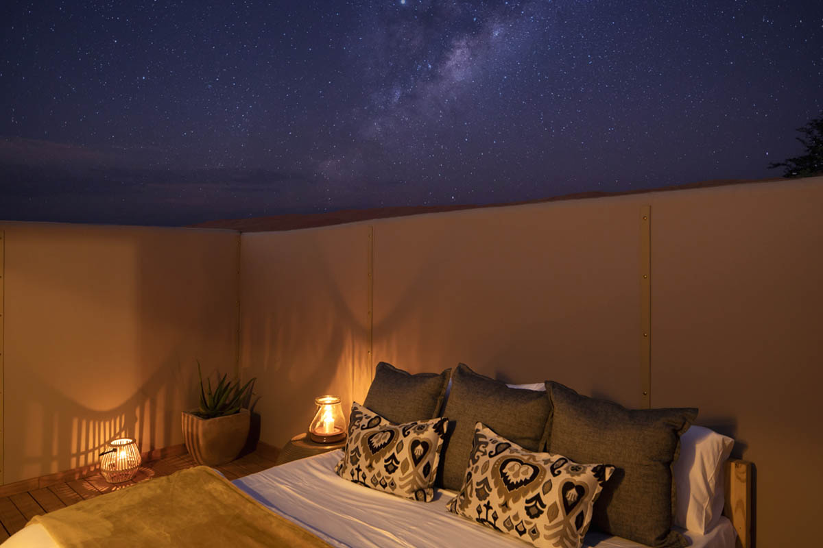 The lodge is made up of 10 air-conditioned chalets with canvas walls and thatched roofs. Each bedroom has a separate ‘star gazer’ platform, the perfect spot to watch the stars above. There is a main dining area and lounge as well as a swimming pool, and the entire lodge has stunning views of the surrounding desert landscape.