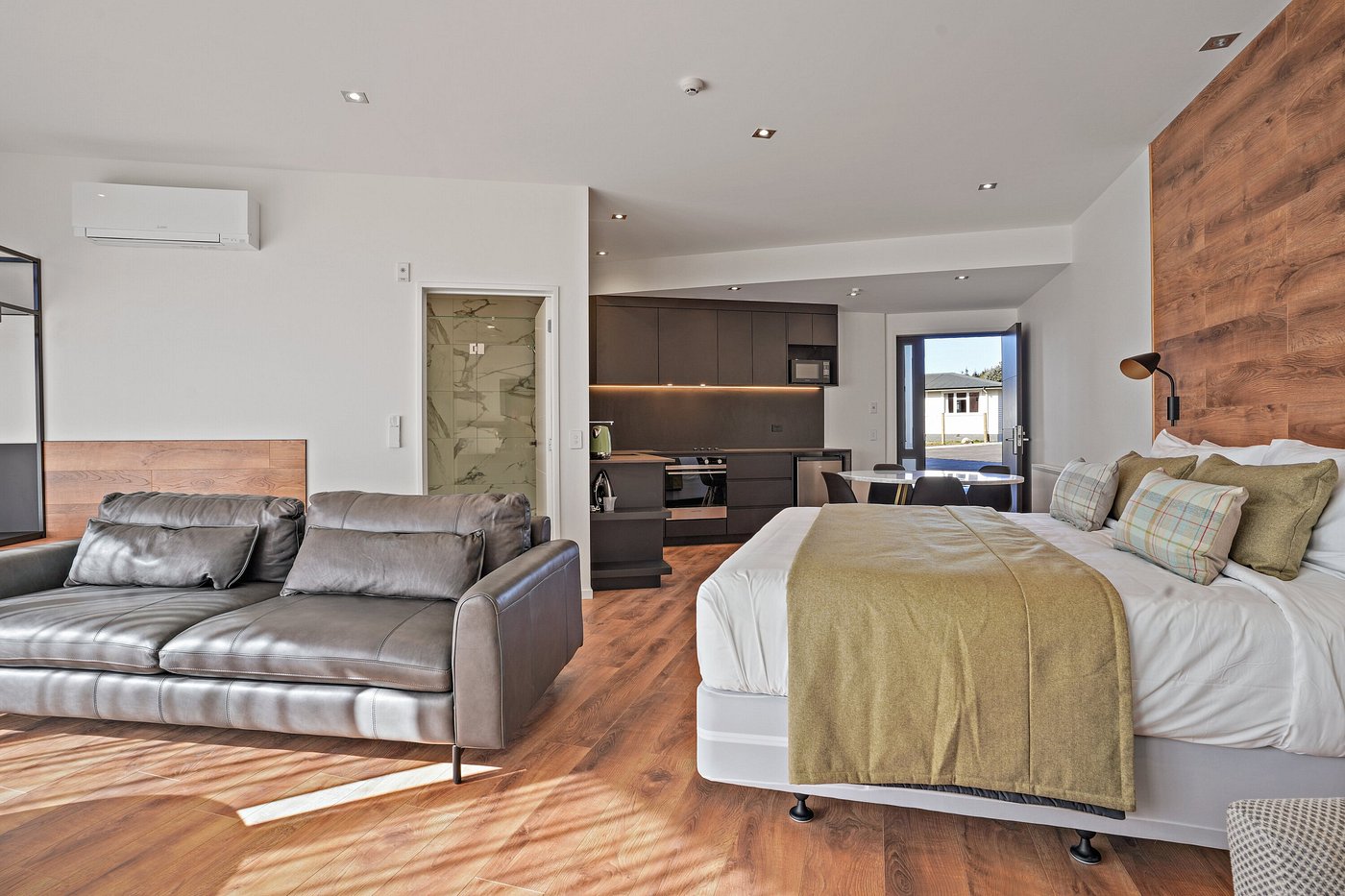 Grand Suites Lake Tekapo is a modern, apartment-style accommodation located just a short walk from the lakefront and village center. The property offers spacious studios and one-bedroom suites, each with contemporary furnishings, kitchenettes, private balconies or patios, and views of the Southern Alps or Lake Tekapo. Designed for comfort and convenience, the suites feature floor-to-ceiling windows, smart TVs, and generous living areas. It's a quiet, well-equipped base for travelers exploring the region’s natural attractions, including stargazing at the Dark Sky Reserve, walking trails, and the Church of the Good Shepherd.