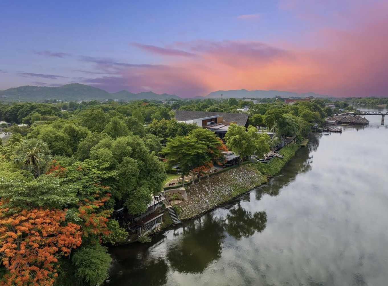 U Inchantree is a charming boutique hotel located on the north bank of the Kwai Yai River, close to the famous River Kwai Bridge. The hotel features 50 hotel rooms in two-story buildings set around a courtyard, dominated by an ancient “Inchantree” from which the resort derives its name. The overall design of the resort is a rustic river lodge style surrounded by landscaped gardens. Enjoy freshly prepared cuisine with spectacular views of the River Kwai at the Thai Peppers restaurant or sundowners at the sunset terrace lounge.