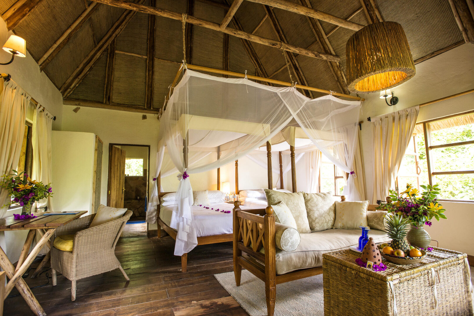 The eight individual cottages each have their own view of the forest, have been styled with warm luxurious interiors, inviting four poster beds and locally-inspired furniture.