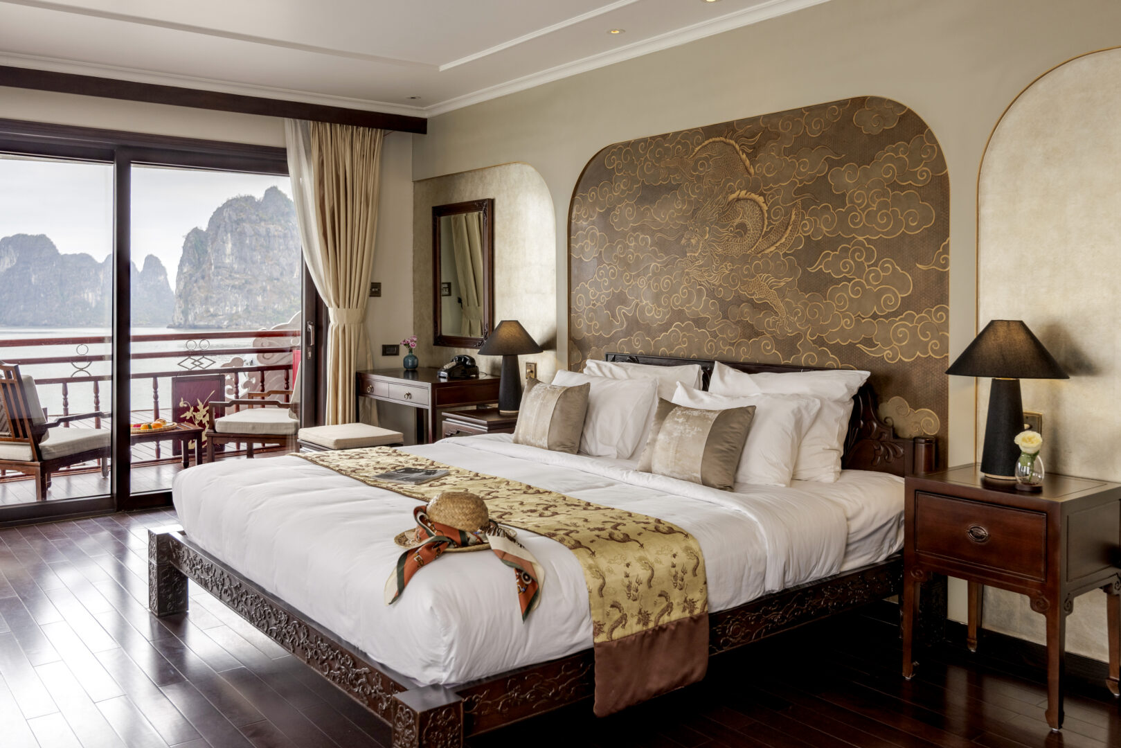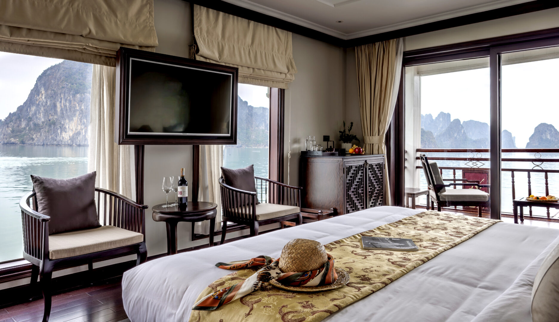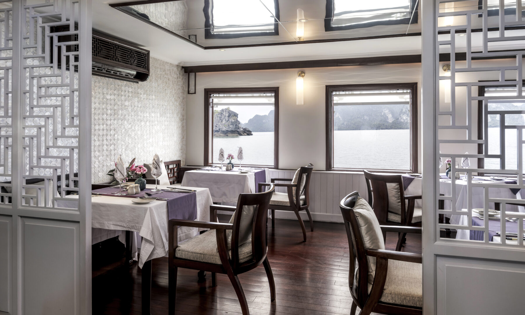 Violet is Heritage Line's luxury vessel. Glossy wooden floors, opulent silks and velvets, selected artefacts and ornaments are the hallmarks of this Art Deco ship. As a one-of-a-kind, she sails the famed Halong Bay in the Gulf of Tonkin, offering her occupants the ultimate in privacy. With just 6 bright, spacious suites - each with an individual, striking interior - Violet is perfect for romantic sojourns, wellbeing cruises or private voyages. All suites are luxuriously appointed and have beautiful private balconies. Cruising Halong Bay aboard this unique boutique ship is sure to be an unforgettable experience for individuals, couples or small groups.