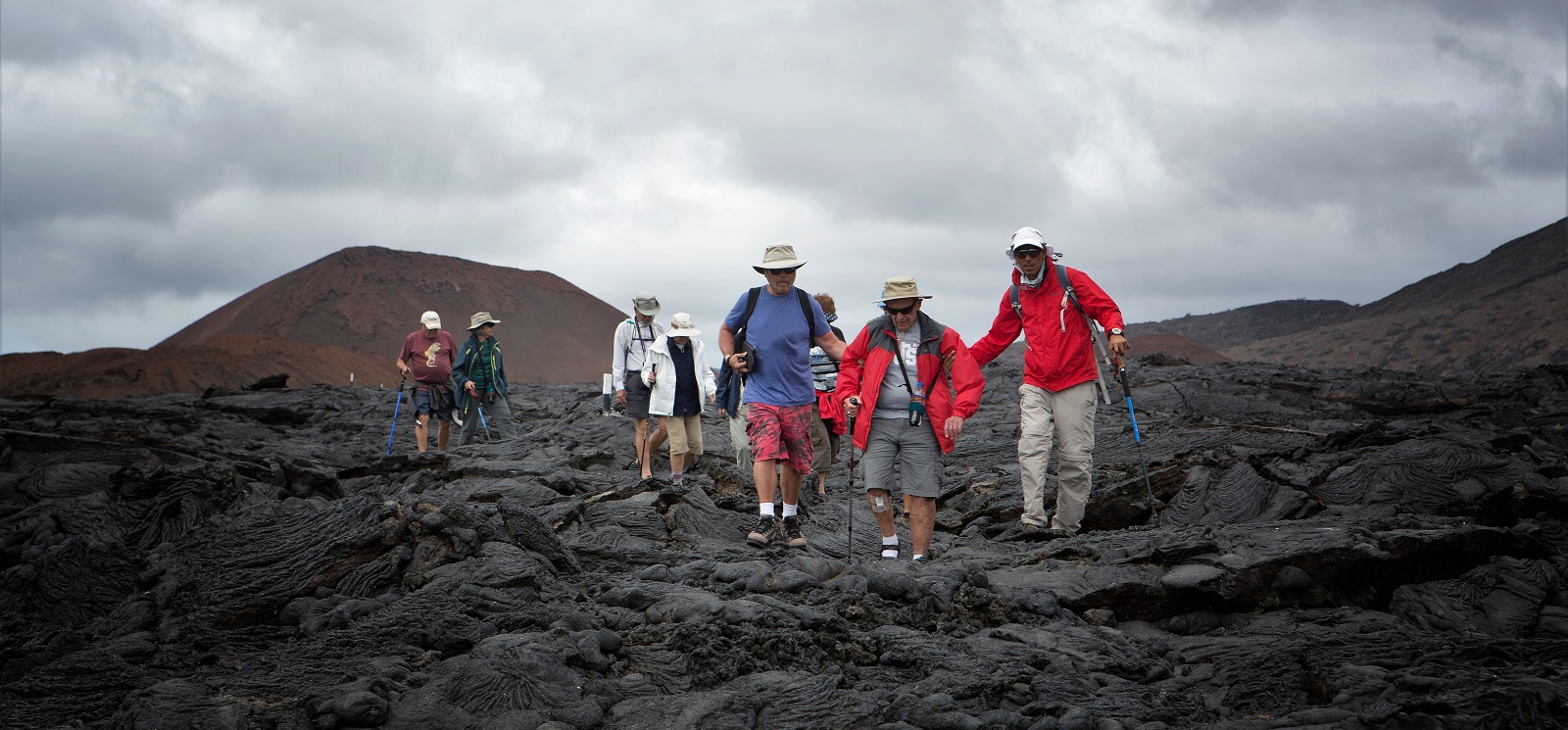 Galapagos islands, Ecuador - October 2, 2017. Tourists explore the lava fields on Bartolome island (Galapagos).