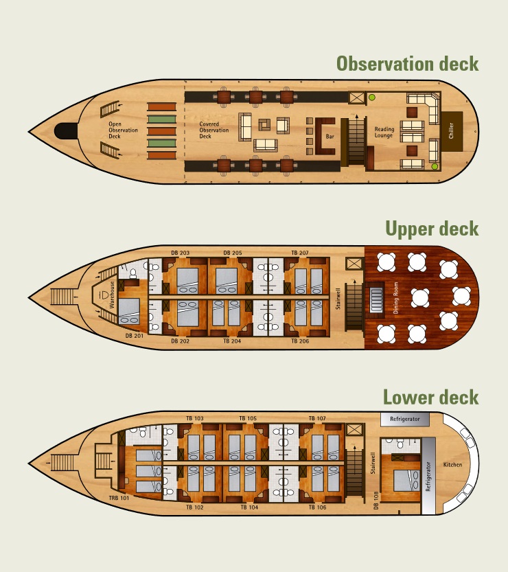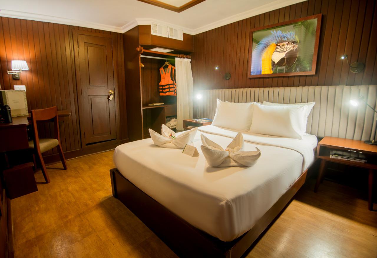 Construction Year: 1994 Registered in: Peru Vessel Type: River Cruise Length: 124 feet (38 meters) Beam: 28 feet (8.6 meters) Draft: 7 feet (2.6 meters) Gross Tons: 820 Speed: 8 knots Main engines: 1 x Caterpillar de 322 HP Safety: Radio communication system with separate battery, satellite phone, life jackets, flare signals, fire extinguishers and smoke detectors in each cabin, on-board defibrillator. Crew: 15, including Cruise Director and 2 naturalist bilingual guides (English-Spanish).