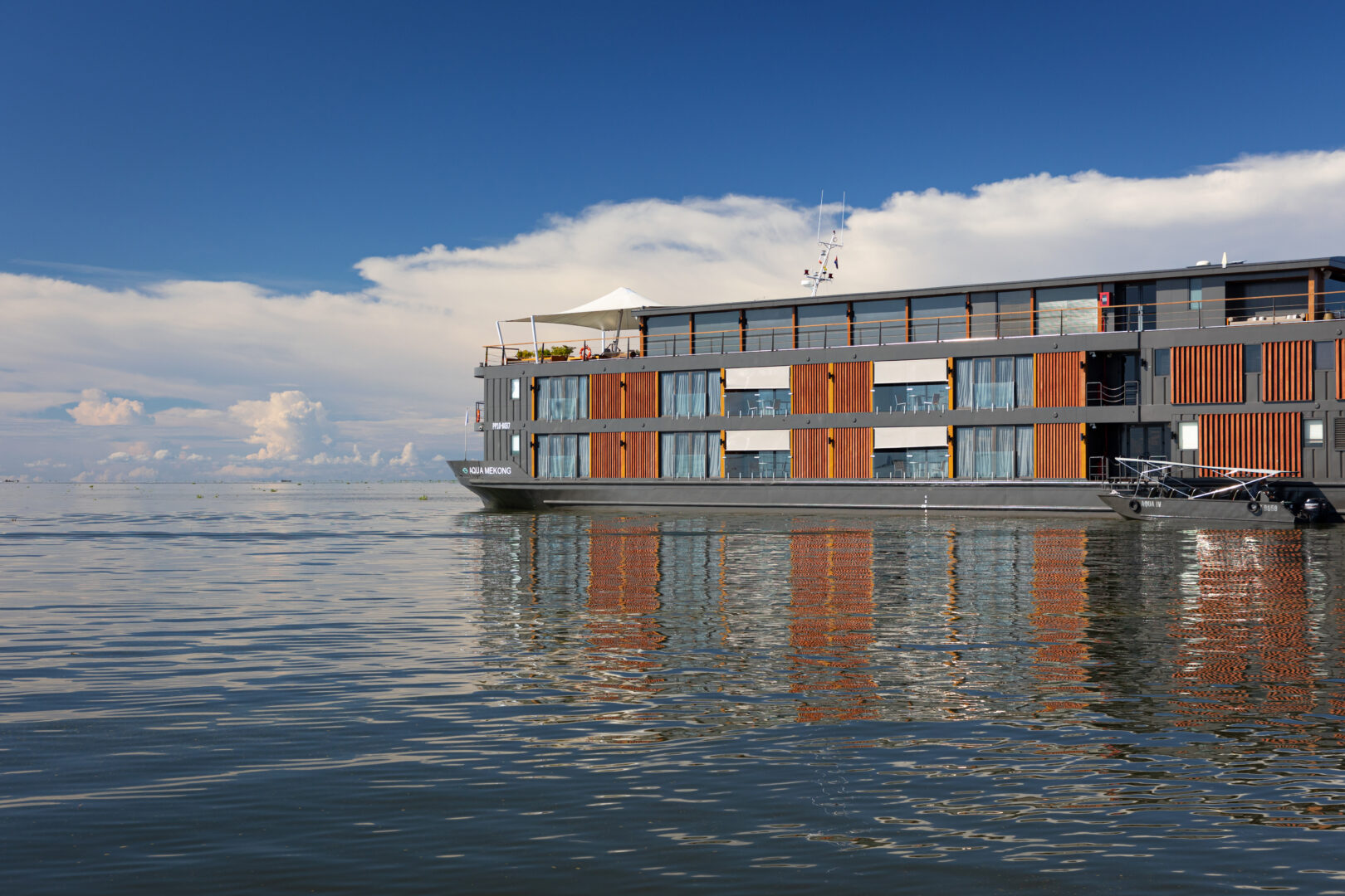 Year Built: 2014 Ports of Embarkation: My Tho (Vietnam), Phnom Penh and Siem Reap (Cambodia) Vessel’s Registry: Cambodia Type of Vessel: River Expedition Vessel Length: 62.4 meters / 205 feet Beam: 11.5 meters / 38 feet Draft: 1.5 meters / 5 feet Cruising Speed: 12 knots Electricity: 220 volts Engines: 2 New Caterpillars, Tier 3 Emission compliant Generators: 2 New Caterpillars, encapsulated for noise reduction Water: Reverse osmosis and UV water treatment plant AC: Central air-conditioning throughout Laundry: Complimentary service (no dry cleaning on board) Internet: Complimentary satellite internet with intermittent connection