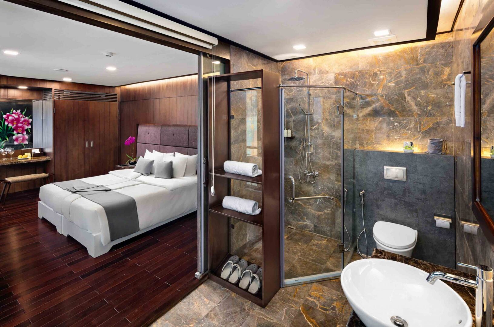 Consisting of 14 spacious suites with balconies and private baths overlooking the gulf, a spa, and an outdoor jacuzzi on its sundeck, the Orchid offers the perfect way to explore Halong Bay in style. There are 8 suites located on the first deck (36sqm) and 4 premium suites located on the upper deck (36sqm). Both suites and premium suites feature a private balcony and separate seating area. There are 2 exclusive suites located on the upper deck. These suites measure 45sqm and feature a private deck and wrap-around windows.