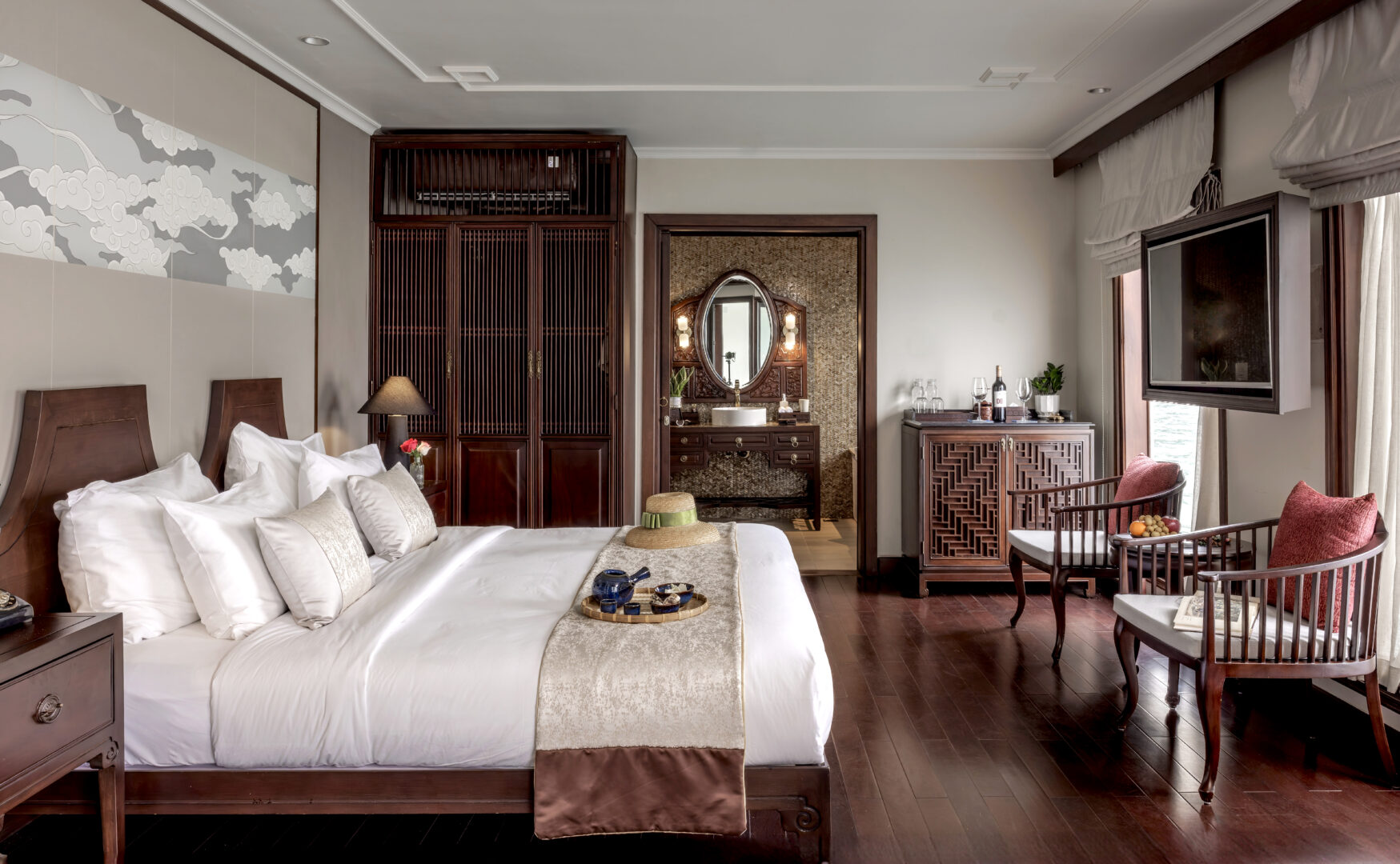 The Violet features just 6 total suites, making for an intimate cruising experience. On the main deck there are 2 Junior Suites. These measure 32sqm and feature on oversized bathroom and private balcony. On the upper deck, there are 4 Imperial Suites at 38sqm. All Imperials Suites are decorated in art-deco style and feature amazing views through the floor to ceiling windows and from each room’s private balcony.
