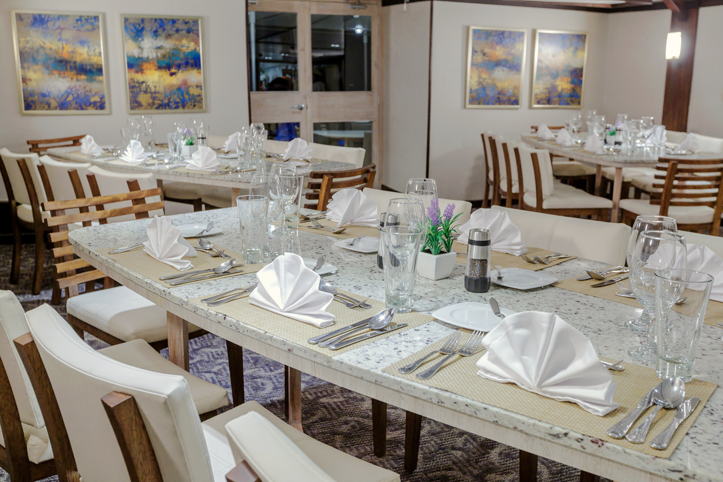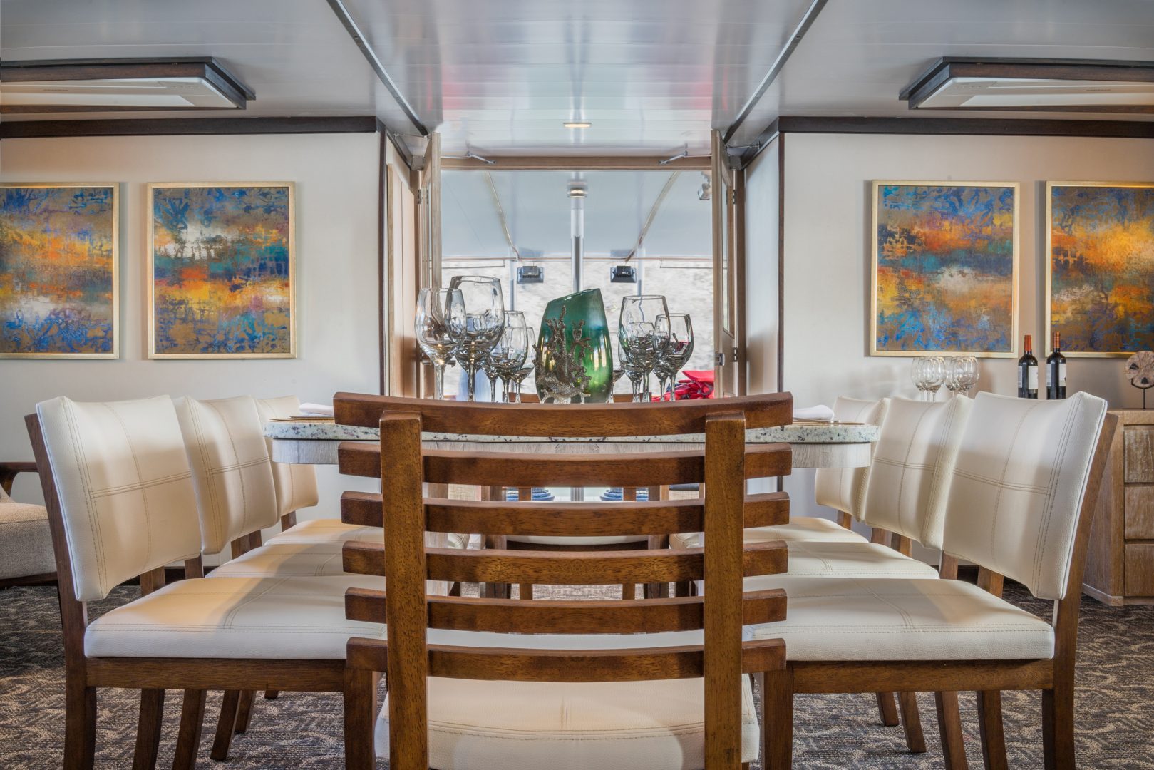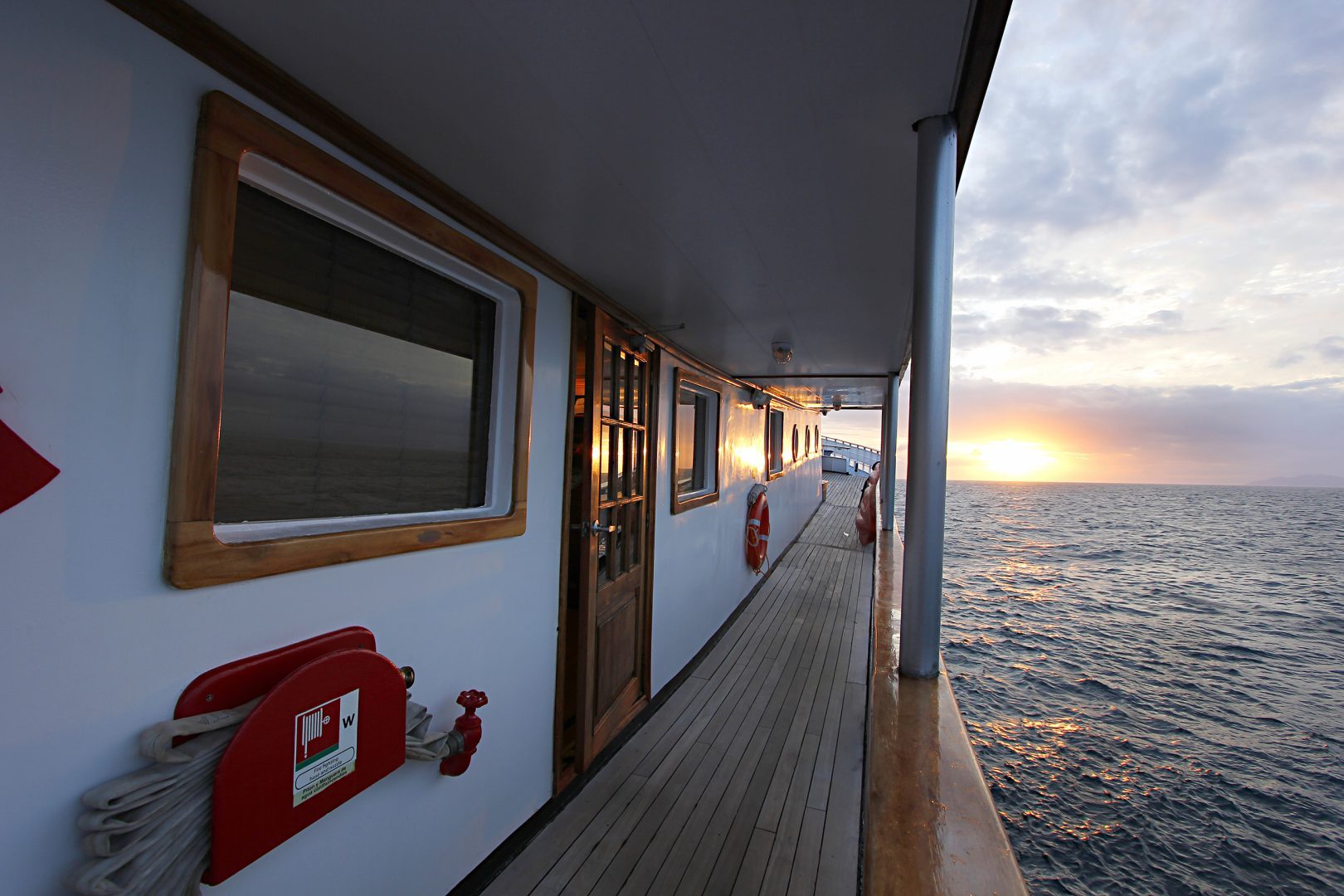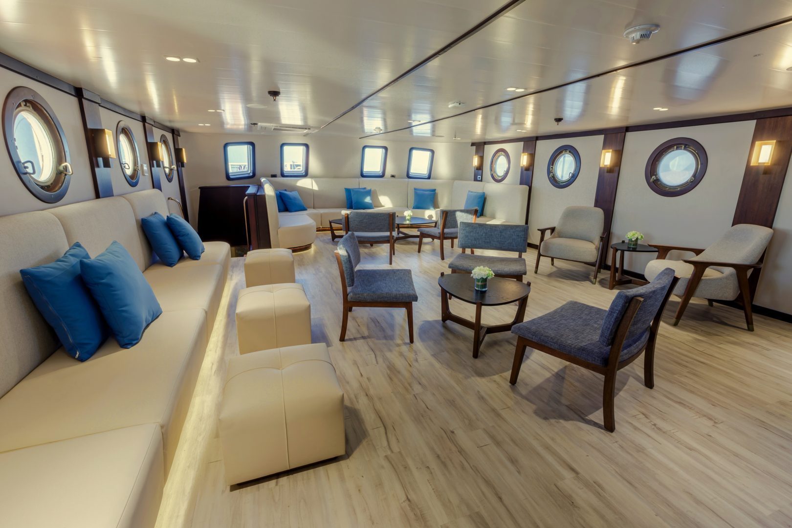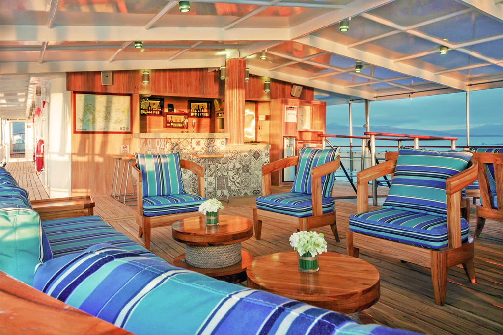 Beagle Deck: This is the main deck of the yacht where on the interior you will find the dining room, the reception area with our onboard boutique, and the main lounge . On the outside of this deck, you will find the al-fresco dining area at the stern, and the Jacuzzi with lounge chairs for sunbathing on the bow.