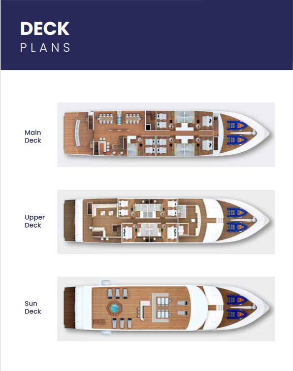 Construction: completed in 2018 Type: Luxury Vessel Length: 135 feet (31 meters) Beam: 31 feet (9.5 meters) Speed: 12 knots Crew: 9 plus 1 Naturalist Multilingual guide