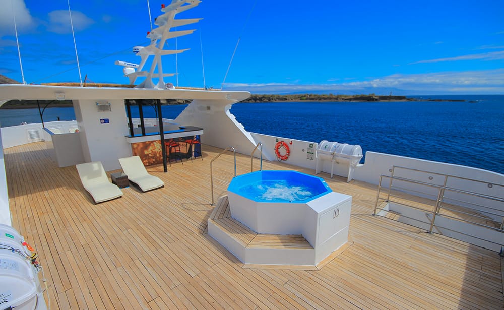 There are 4 spacious deluxe balcony suites (269 sq. ft.) each with a private balcony and 5 standard cabins (215 sq. ft.) with panoramic windows. Vessel capacity is 16 passengers plus crew. Amenities include a jacuzzi on the sun deck, two dining areas (indoor and outdoor), a living area, and sun terrace.