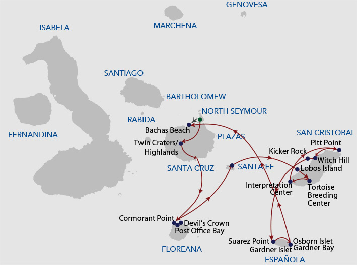 One of the newest offerings in the Galapagos, this trimaran offers greater stability than a double-hull vessel. With private balconies off every spacious cabin, the Horizon provides a high-quality, intimate experience with alfresco dining, an outdoor jacuzzi, and an indoor lounge area. Excursion options include hiking, snorkeling, and kayaking. All excursions are led by a top-quality bilingual naturalist guide.
