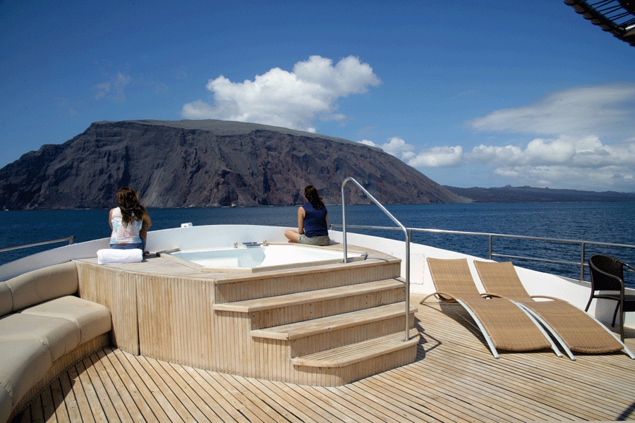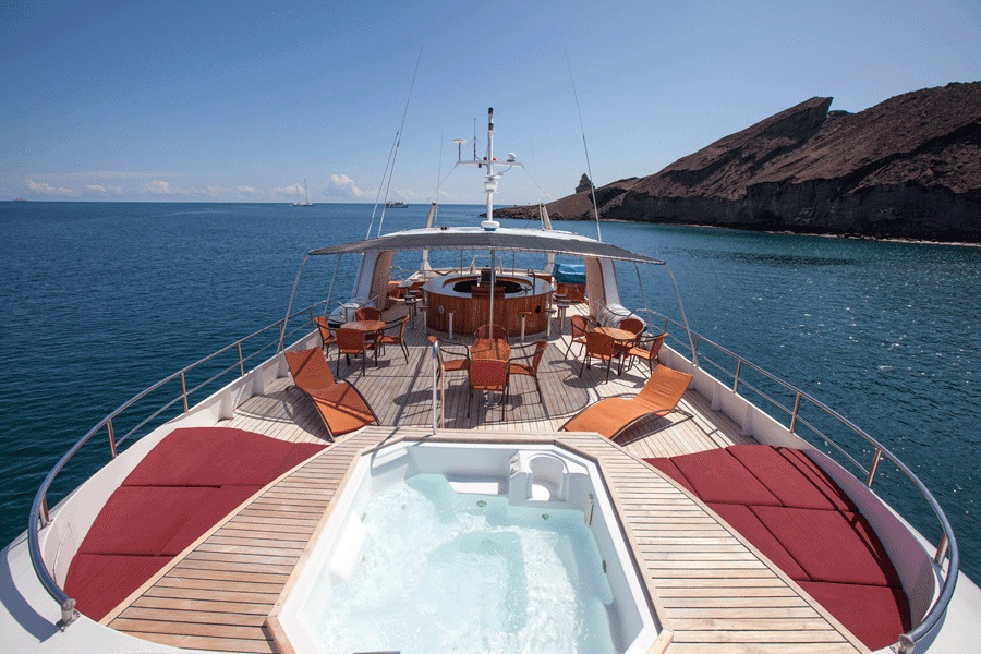 Integrity is a 141-foot luxury yacht that accommodates 16 passengers in 9 cabins. The yacht utilizes state-of-the-art stabilizers to provide a smooth journey, and has a spacious sun deck with spa and bar. Excursion options include hiking, snorkeling, and kayaking, and all excursions are led by a top-quality bilingual naturalist guide. With impeccable furnishings and beautiful common spaces, the Integrity is an excellent choice for luxury small-ship cruising in the Galapagos.