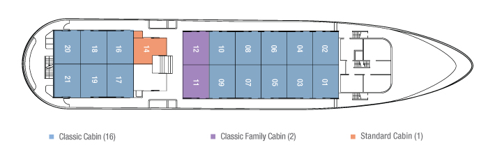 The Isabela II has 1 Owner’s Cabin on the upper deck (180 square feet), 18 Classic Cabins on the cabin deck (138 square feet, twin beds or double bed), and 1 Standard Cabin on the cabin deck (128 square feet, double bed).