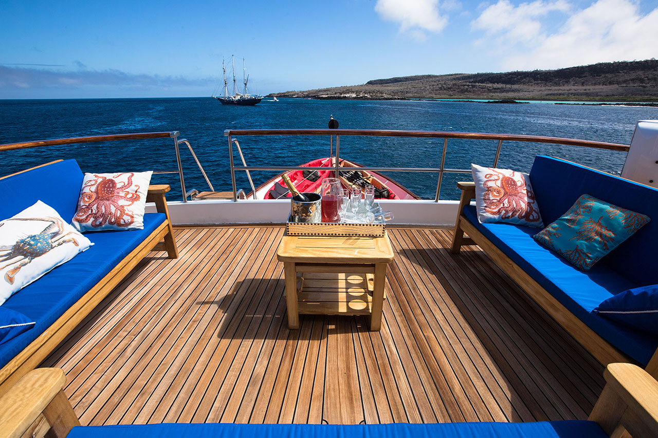 The Passion, Galapagos' luxurious triple-deck motor yacht, features ample interior and exterior social areas, a panoramic sky lounge with bar and sliding glass doors, a separate dining room, and wonderfully spacious decks, including a sun deck with lounge chairs and a Jacuzzi. The Passion accommodates up to 14 guests in its five spacious staterooms and two suites, each with air conditioning and a marble en suite bathroom. With a crew of 12+, this elegant vessel offers a 1-to-1 service ratio for a very personalized experience. All excursions are done in the company of a bilingual naturalist guide. Activities available on the Passion include hiking, snorkeling, and kayaking.