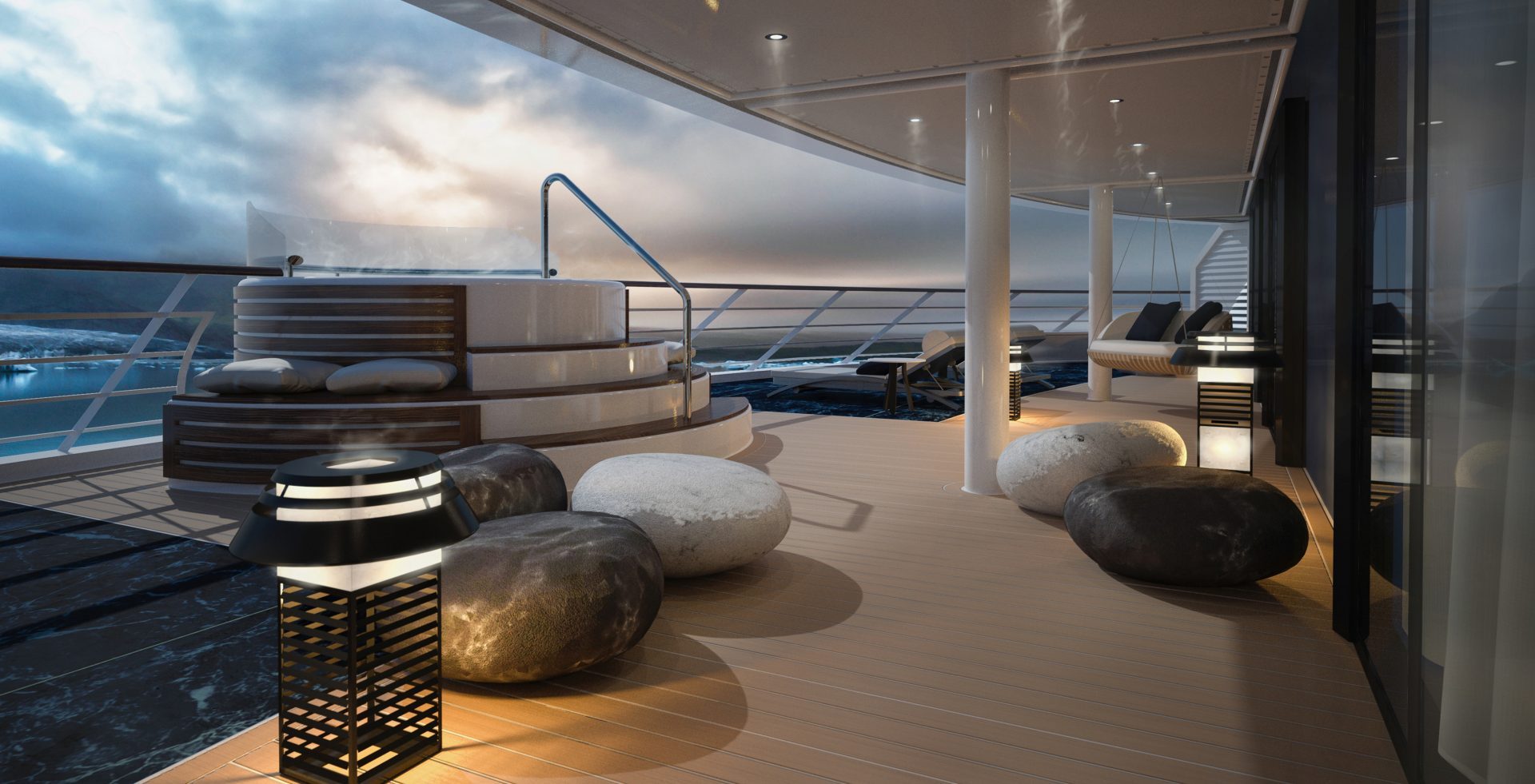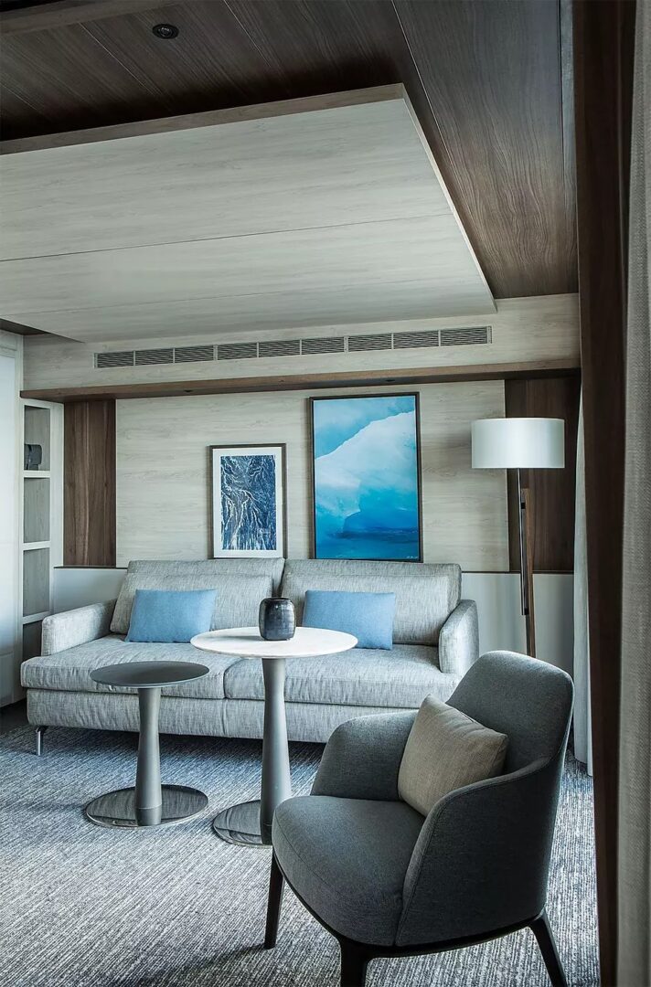 This superb mega-yacht with 135 cabins and suites was designed in France and built in Norway. The indoor swimming pool, the conservatory, the panoramic restaurant, the Blue Lagoon outdoor restaurant, the Main Lounge, the Observation Lounge, the lobby… Each of the common areas has been designed to both convey French-style discreet luxury and arouse wonder and amazement. The common thread running through all their designs is the desire to allow the light to penetrate and open everything up the extraordinary polar landscapes and scenery. This very first hybrid-electric polar exploration ship powered by LNG has been designed with the greatest attention to detail in terms of safety and respect for the environment.