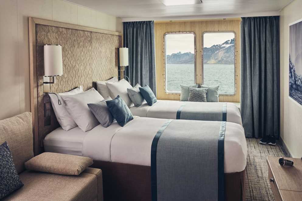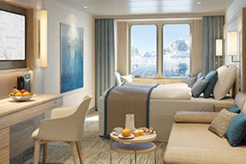 • Category 1 (Fore Deck—Standard cabin with two large windows, Alcove seating, Relax chair, 183 square ft. #406, 408, 411, 413, 415)