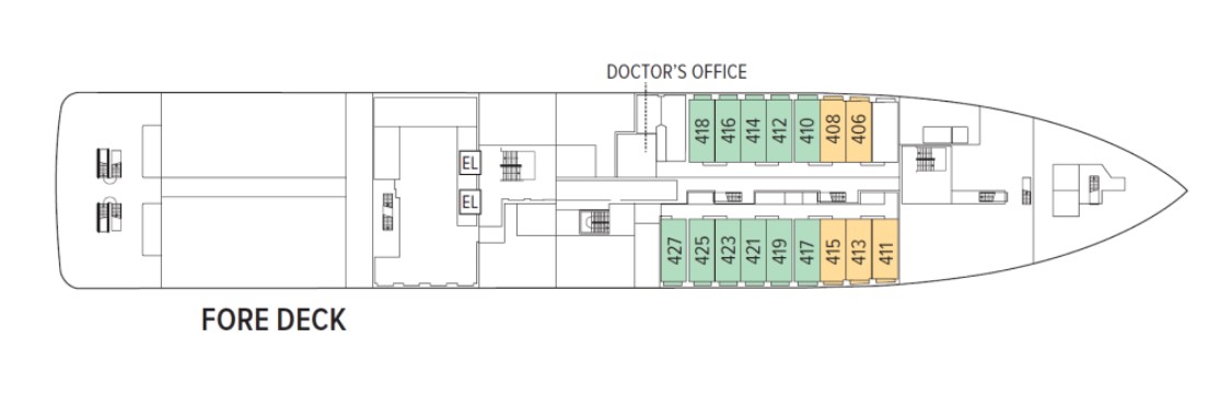 • Category 2 (Fore Deck—Standard cabin with two large windows, Alcove seating, Relax chair, 205 square ft. #410, 412, 414, 416-419, 421-427)