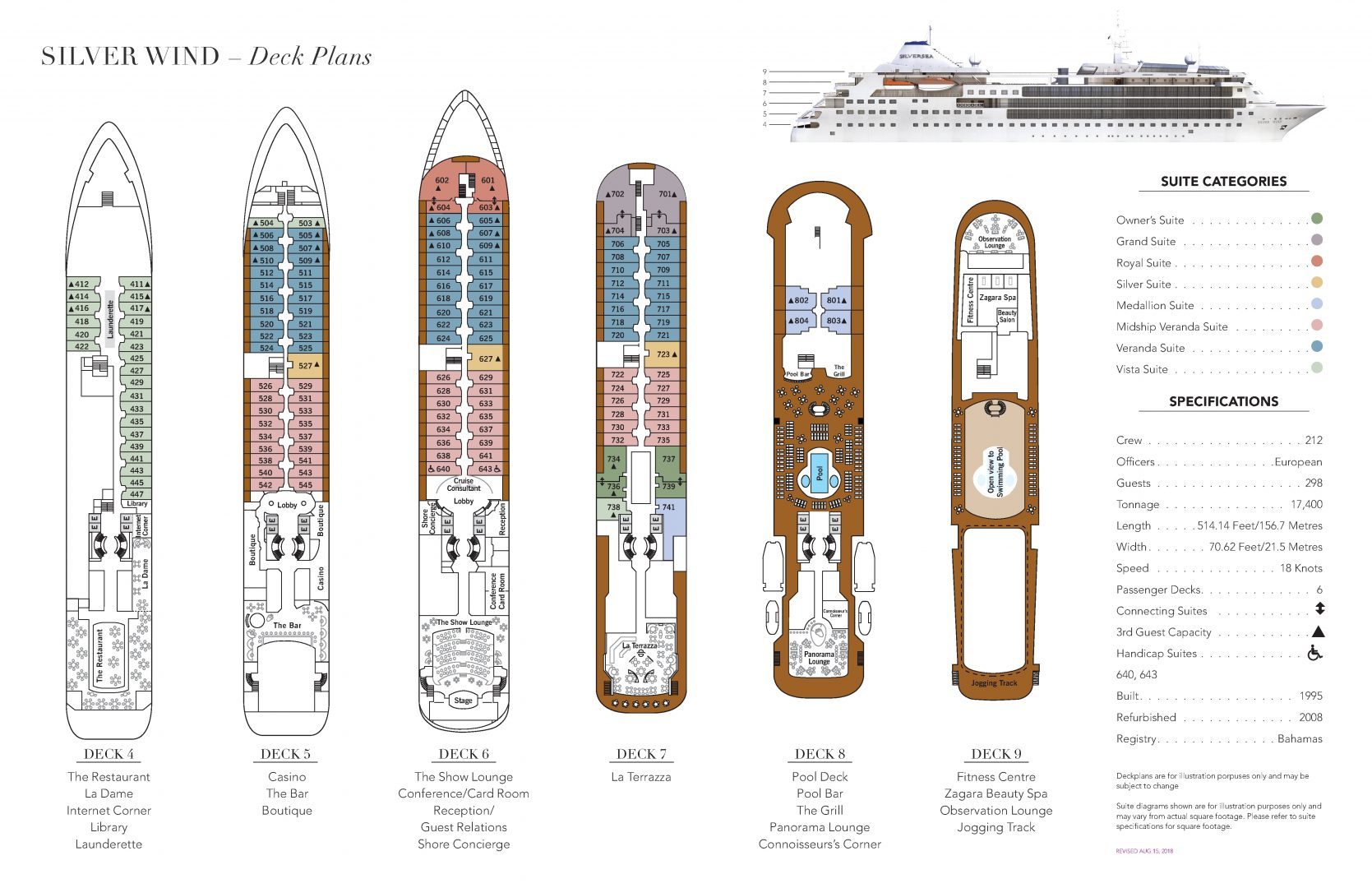 Staff & Crew: 239 Guests: 274 Length: 514 ft. Width: 71 ft. Tonnage: 17400 Average Speed: 18 knots Class: Lloyd's 1C Refurbished: 2021