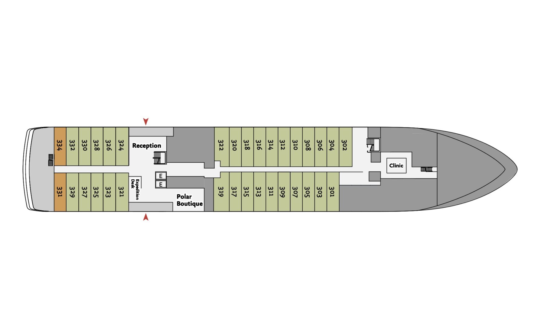 Explorer Triple: Located on Deck 3 and approximately 285 sq. ft. (26.5 m2), these cabins are for guests traveling solo who want to share their experience with other like-minded travelers of the same gender, or for groups of three traveling together.