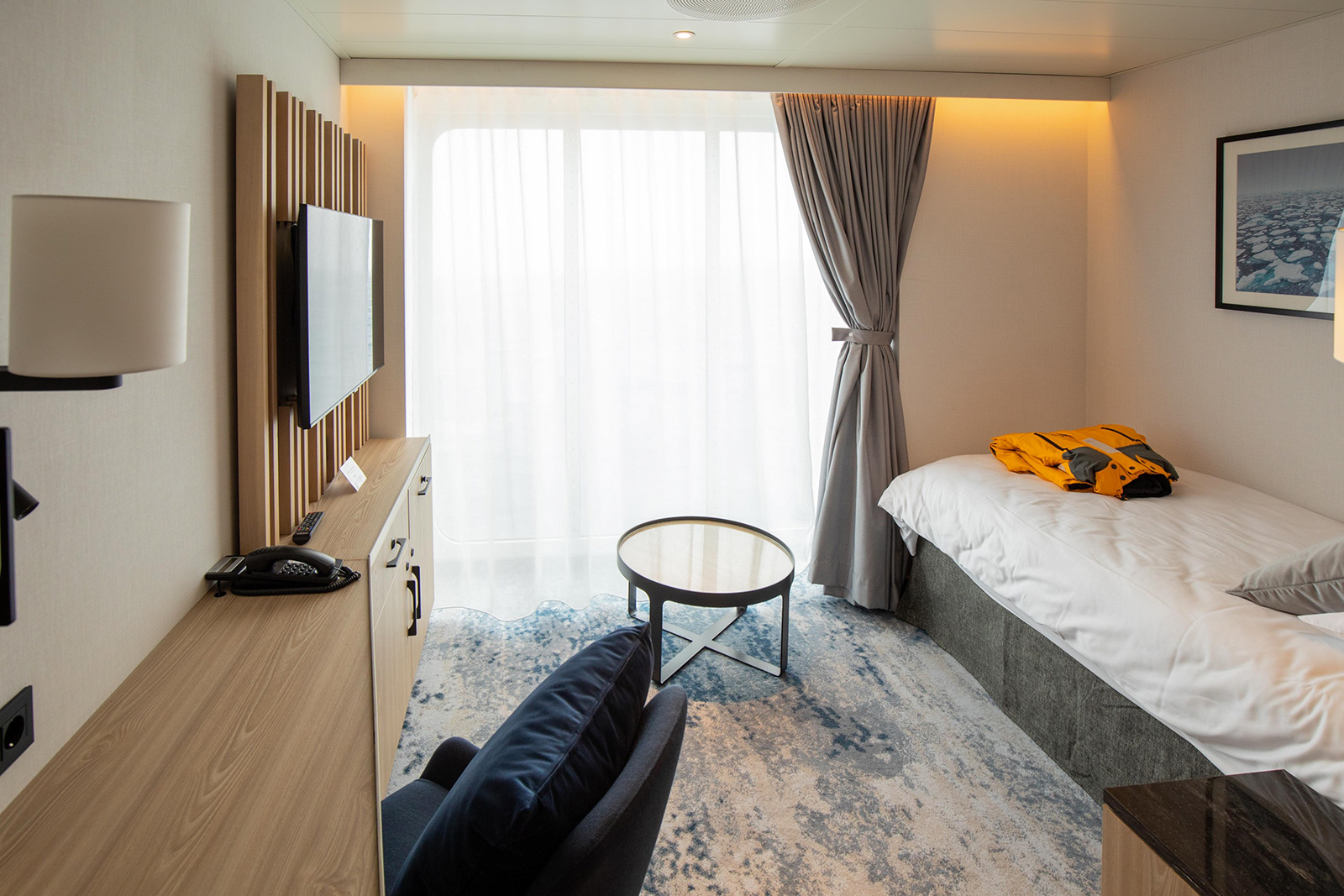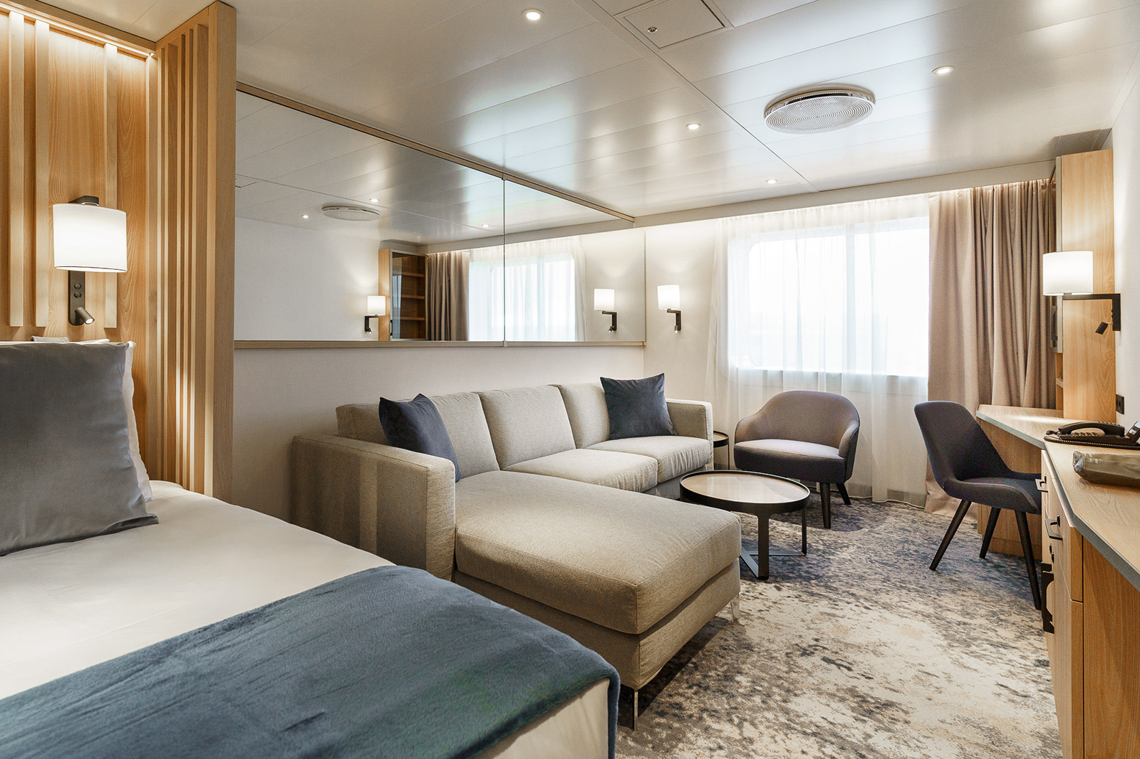 Explorer Suite: Located on Deck 3 and approximately 285 sq. ft. (26.5 m2), these suites are for people traveling together or solo guests looking to share with like-minded individuals. This suite maximizes interior living space while still offering guests the opportunity to stay connected to the outdoors.
