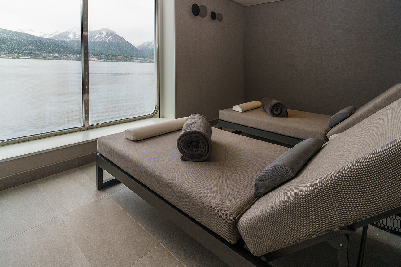Penthouse Suite: The only suite category to be located on Deck 7, with approximately 369 sq. ft. (34.3 m2) of indoor living space and a 67 sq. ft. (6.2 m2) balcony, this suite is for guests wanting to wake up to unobstructed polar views from the warmth and comfort of their bed onboard the ship. These suites offer the best of everything—views, spacious interiors, full bathrooms, and generous balcony sizes—as well as easy access to the wellness center.