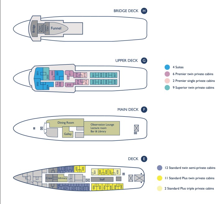 Premier: 6 Twin outside cabins with windows on the upper deck G, private facilities, two lower berths; 2 Single cabins with portholes (view obstructed by lifeboat) on the upper deck G, private facilities.