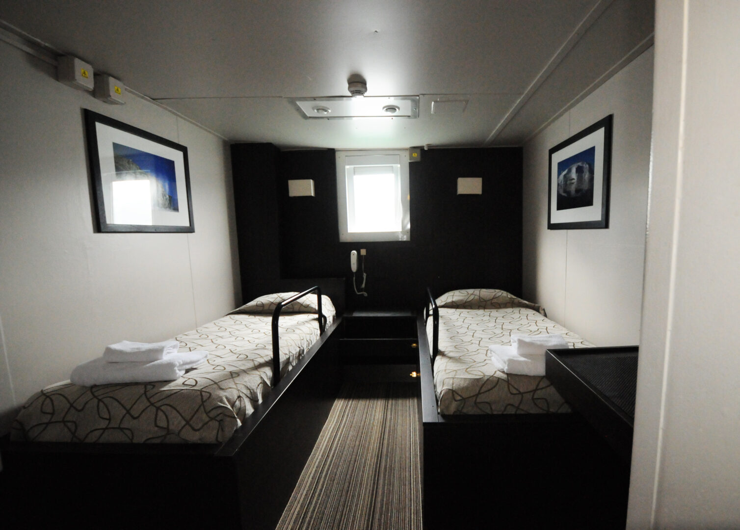 Standard: 12 Twin outside cabins with portholes on deck E, semi-private facilities, two berths (upper/lower).