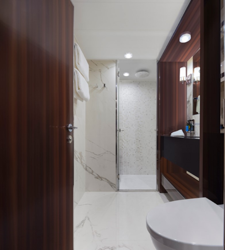 The Navigator Suite –1-bedroom suite with an oversized private balcony. This suite includes Butler Service and Expanded Room Service. Located on Decks 5 and 6, it can accommodate up to 3 guests. 465 sq. ft. of space, with a private balcony and comfortable living room complete with a sofa and vanity. The bathroom has double sinks and a tub, and a walk-in closet and wardrobe.