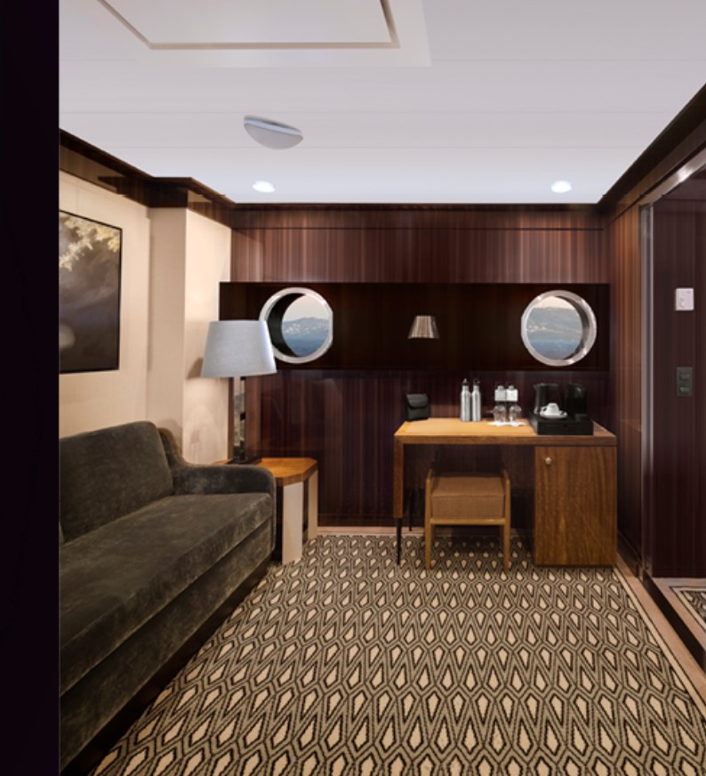 Journey Suite – 1-bedroom suite with a private balcony. This suite includes Butler Service and Expanded Room Service, located on Decks 5 and 6 accommodates up to 3 guests. 382 sq. ft. of living space, with a walk-in closet and wardrobe. Featuring a comfortable living room with a sofa and an elegant vanity and two wall-mounted TVs.