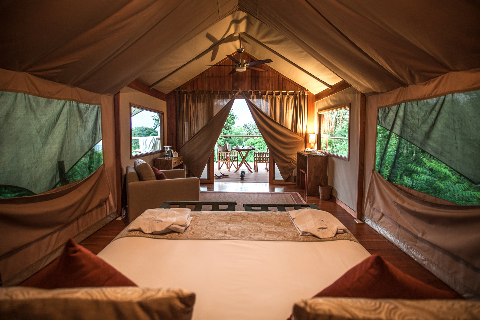 Your exact excursion options will depend on the weather and the time of year, but usually include early morning or nocturnal hikes through the jungle with a highly trained bilingual guide who will help you find the creatures hidden among the dense vegetation. Other activities include an open-air canopy gondola, treetop biking, hiking to pristine waterfalls and nature trails highlighting hummingbirds, capuchin monkeys and the unique flora of the area.