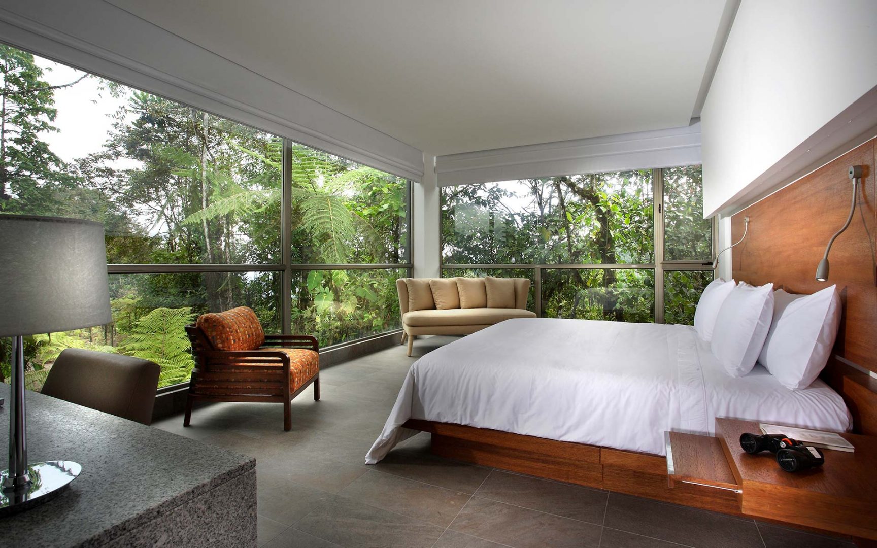 Situated high in the Andes on a plateau in Ecuador’s Mashpi Rainforest Biodiversity Reserve, Mashpi Lodge offers up-close views of the lush rainforest that surrounds it. The lodge is sophisticated and modern, built with the latest sustainability techniques and designed to blend beautifully with its surroundings. Each of the 22 rooms has floor-to-ceiling windows overlooking the jungle, as does the 2-story dining room, which features gourmet Ecuadorian-fusion cuisine.
