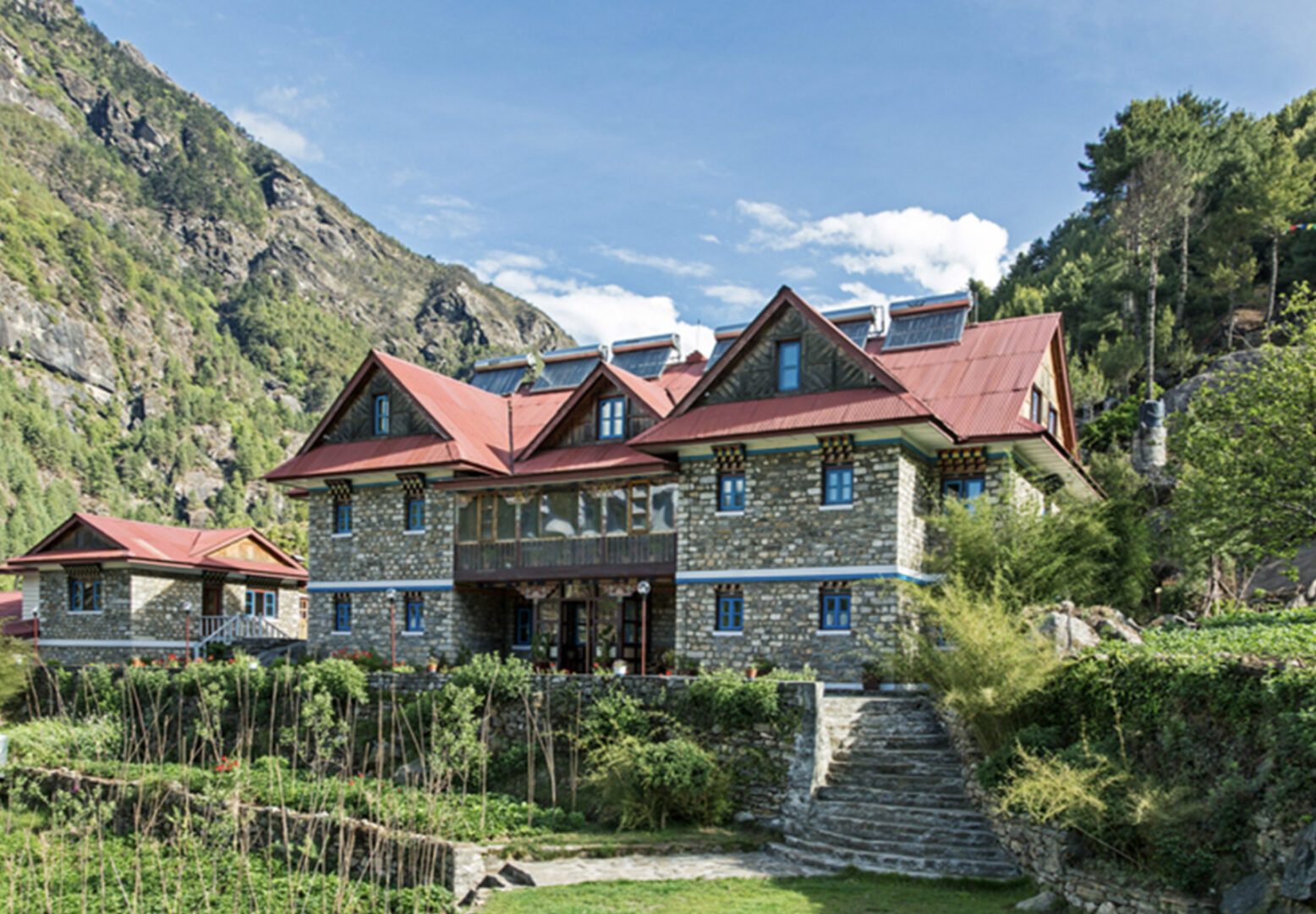 Approximately four hours hike from Lukla. Phakding Lodge is set in an idyllic part of the Dudh Koshi river gorge, just before a small bazaar. To get a sense of how this Mountain Lodge has spent over a decade working on sustainable farming practices, stroll over to the vegetable garden and see what seasonal produce you might be served at dinner. Rooms are finished in a combination of traditional Khumbu and modern style with lashings of natural wood. En-suite bathrooms, heated beds, and soft, clean sheets ensure your comfort, along with the spectacular view of the mountains. At the restaurant, enjoy a fully stocked bar and an à la carte menu.
