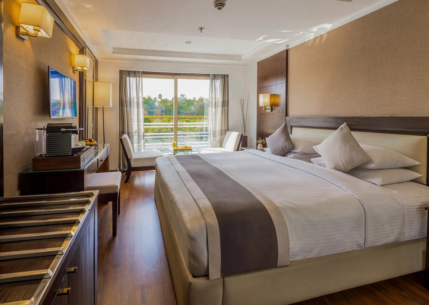 Farah is a luxury cruise ship that sails along the Nile River between Luxor and Aswan in Egypt. It offers 56 deluxe cabins and 2 Royal Suites, all outfitted with handmade Egyptian cotton sheets and handmade furniture. The ship offers a variety of facilities and amenities such as a large swimming pool on its sundeck, ample indoor and outdoor lounge spaces, a library, a restaurant and bar, a gym, a spa including a steam room and sauna, a hairdresser, and more.