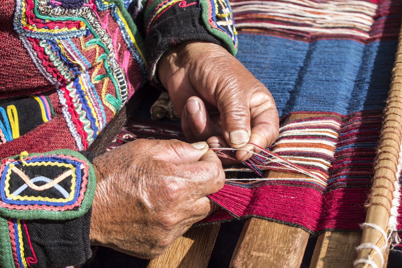 Visit Chinchero, a traditional small town situated on a plateau overlooking the Sacred Valley. Explore a colonial church with remarkable paintings and frescoes, which was constructed over the ruins of an Incan temple and is surrounded by impressive Incan terracing. Chinchero is also home to several highly-regarded weaving cooperatives known for their high-quality textiles. Peru is known for its intricate traditional weavings, many of which use symbols to tell stories or depictions of daily life.