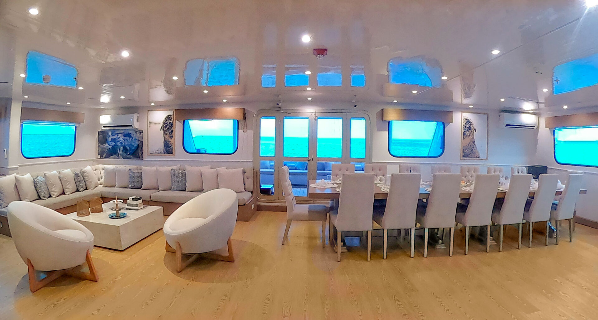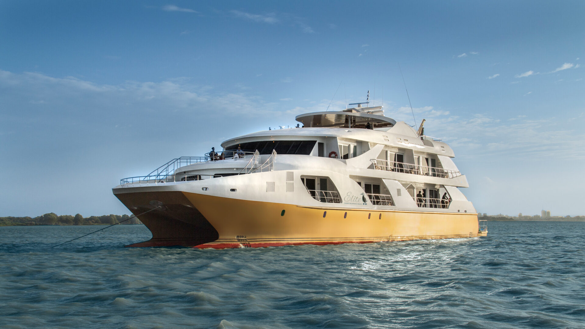 Intimate yet spacious, the Seaman Journey is a comfortable first-class option for exploring the Galapagos. This 16 passenger catamaran offers several sun decks, a dining room and bar/lounge, and a well-stocked “book nook.” All 8 cabins have air conditioning, a private bathroom, and large ocean-view windows that open. The on-board service is warm and attentive and excursions are led by a bilingual naturalist guide; excursion options include hiking, snorkeling, and kayaking.