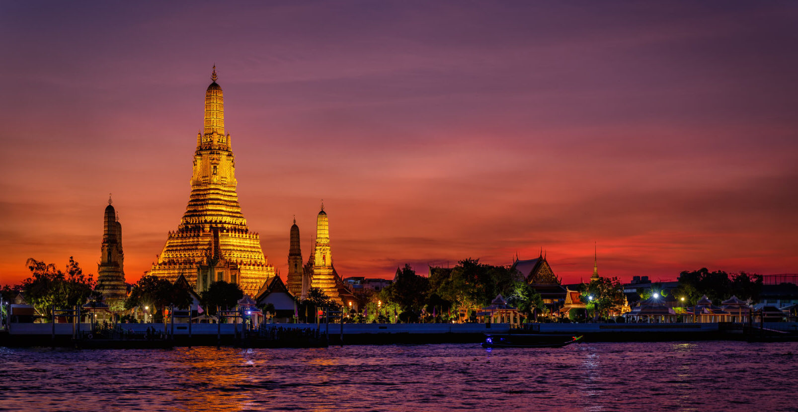 Continue to Wat Arun, the Temple of the Dawn, one of the best-known temples in Thailand, and bid farewell to your longtail. Stroll the pavilions, ascend one of the iconic prangs (towers), and learn about the influence of Buddhism on everyday life. Board a local ferry for the short crossing to the far bank and a local restaurant, where you can enjoy a Thai cocktail and soak up the sunset with a view across the River of Kings.