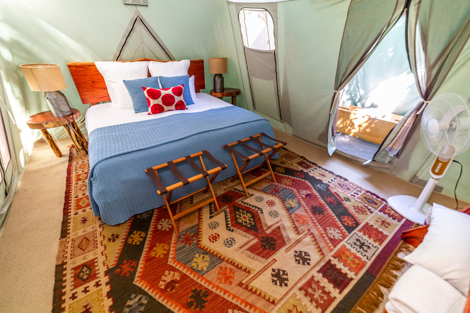 Guests sleep in oversized dome tents (with real beds and sheets). The camp also has composting toilet cabanas and solar-heated shower cabanas (with plenty of privacy in each).